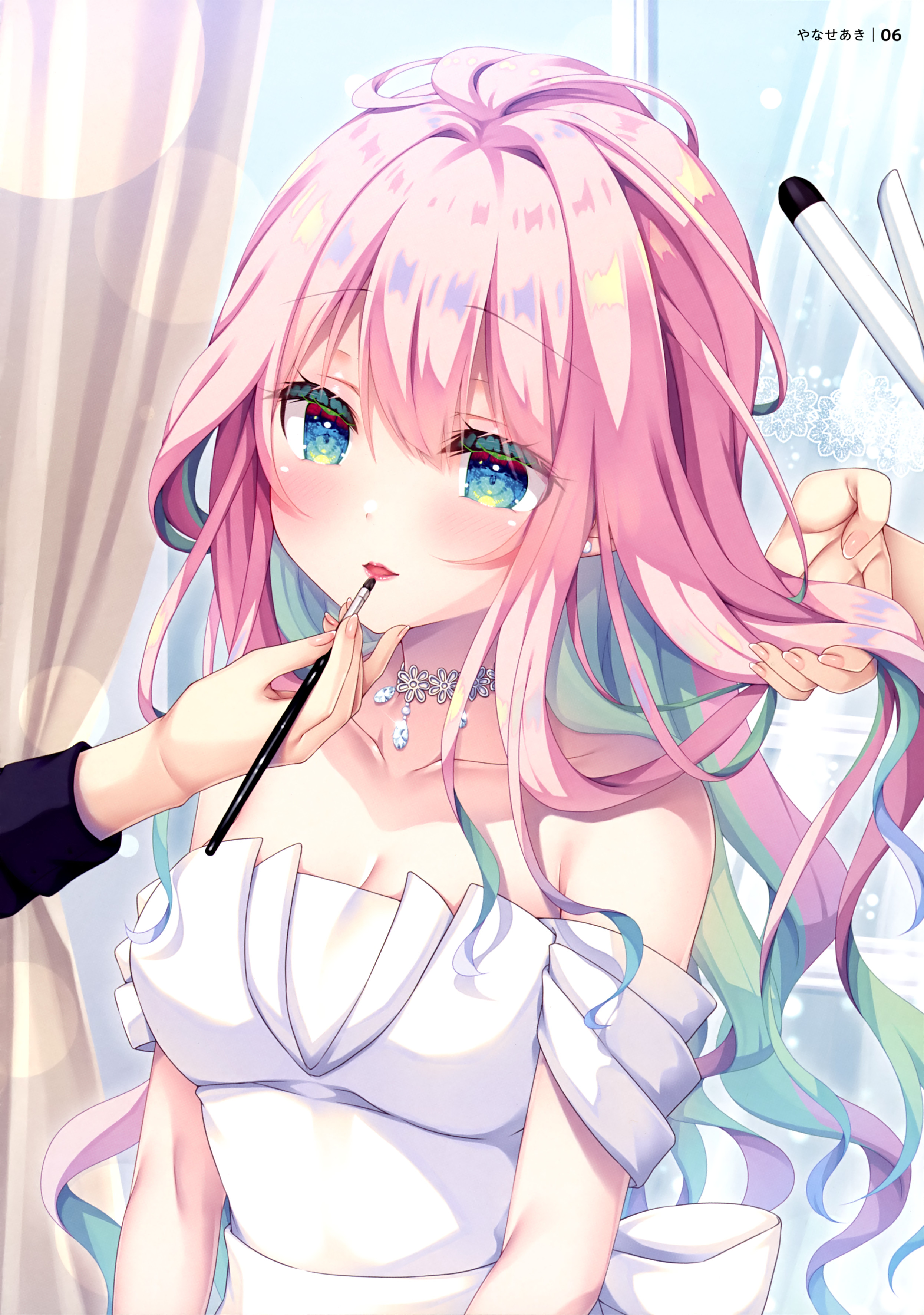 1girl 2others absurdres applying_another's_makeup applying_lipstick applying_makeup aqua_eyes aqua_hair armpit_crease artist_name blue_eyes blurry breasts cleavage collarbone colored_eyelashes colored_inner_hair curtains dengeki_moeoh depth_of_field dress hair_between_eyes hair_intakes highres holding holding_another's_hair holding_brush holding_makeup_brush indoors jewelry light_blush long_hair looking_at_viewer magazine_scan makeup makeup_brush medium_breasts multicolored_eyes multicolored_hair multiple_others necklace off-shoulder_dress off_shoulder original page_number parted_lips pink_hair scan sidelocks solo_focus third-party_source upper_body wavy_hair white_dress window yanase_aki