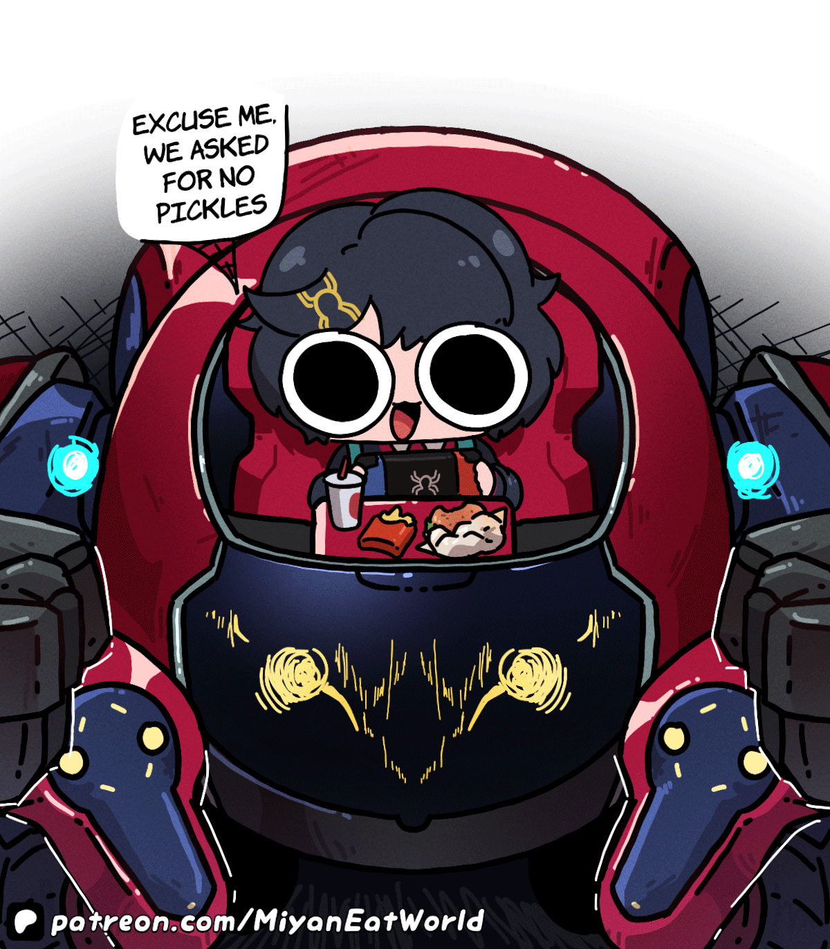 1girl :3 angry animated animated_gif black_hair chibi cockpit commentary english_commentary food glaring hair_ornament hairclip handheld_game_console highres looping_animation marvel marvel_tokon:_fighting_souls mecha miyan_(oceanmaiden) on_mecha patreon_username peni_parker robot sp//dr speech_bubble spider-man_(series) tray wide_shot