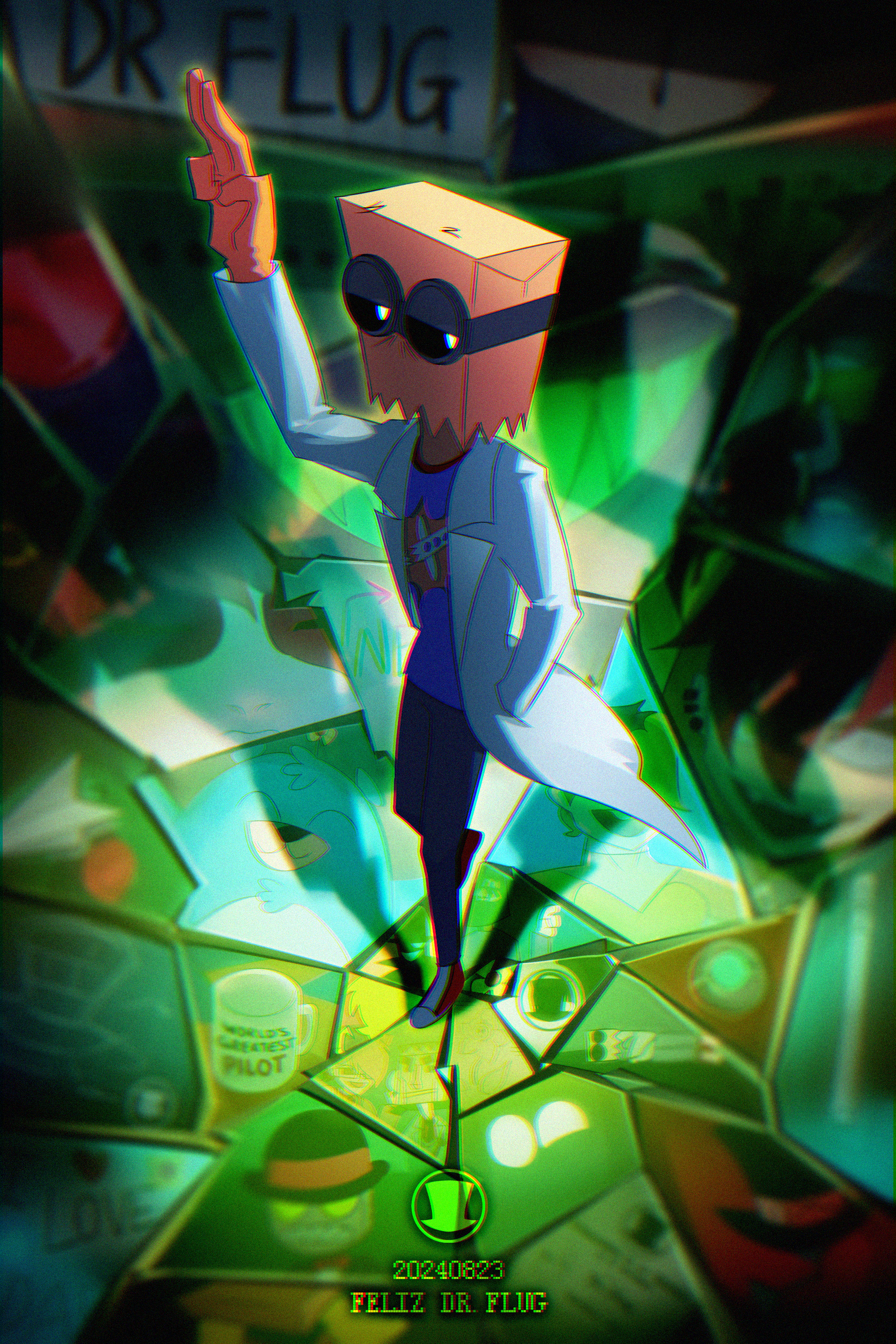 5.0.5. absurdres arm_up bag bag_on_head bear black_hat black_hat_(villainous) blue_shirt character_name closed_eyes coat colored_skin cup demencia dr._flug full_body gloves grey_pants grey_skin hand_in_pocket hat highres insistcurrency lab_coat open_clothes open_coat open_mouth orange_gloves pants red_hair red_shoes shirt shoes smile standing teeth villainous white_coat