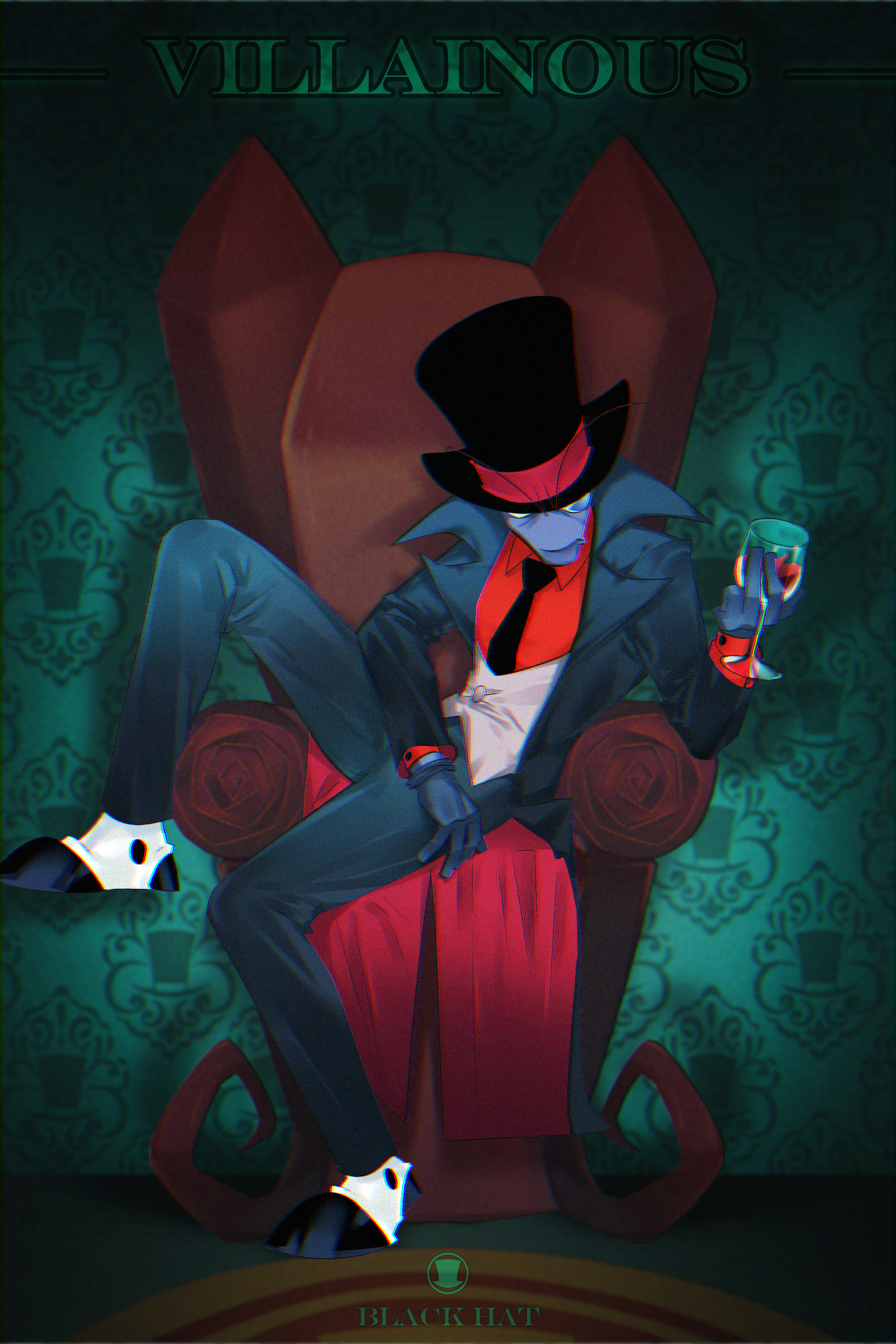 1boy absurdres alcohol black_coat black_hat black_hat_(villainous) black_necktie black_pants black_shoes buttons character_name closed_mouth coat collared_shirt colored_skin copyright_name cup full_body gloves grey_skin hat highres holding holding_cup insistcurrency male_focus monocle multicolored_shoes necktie open_clothes open_coat pants red_shirt shirt shoes sitting solo top_hat two-tone_shoes villainous white_shoes wine