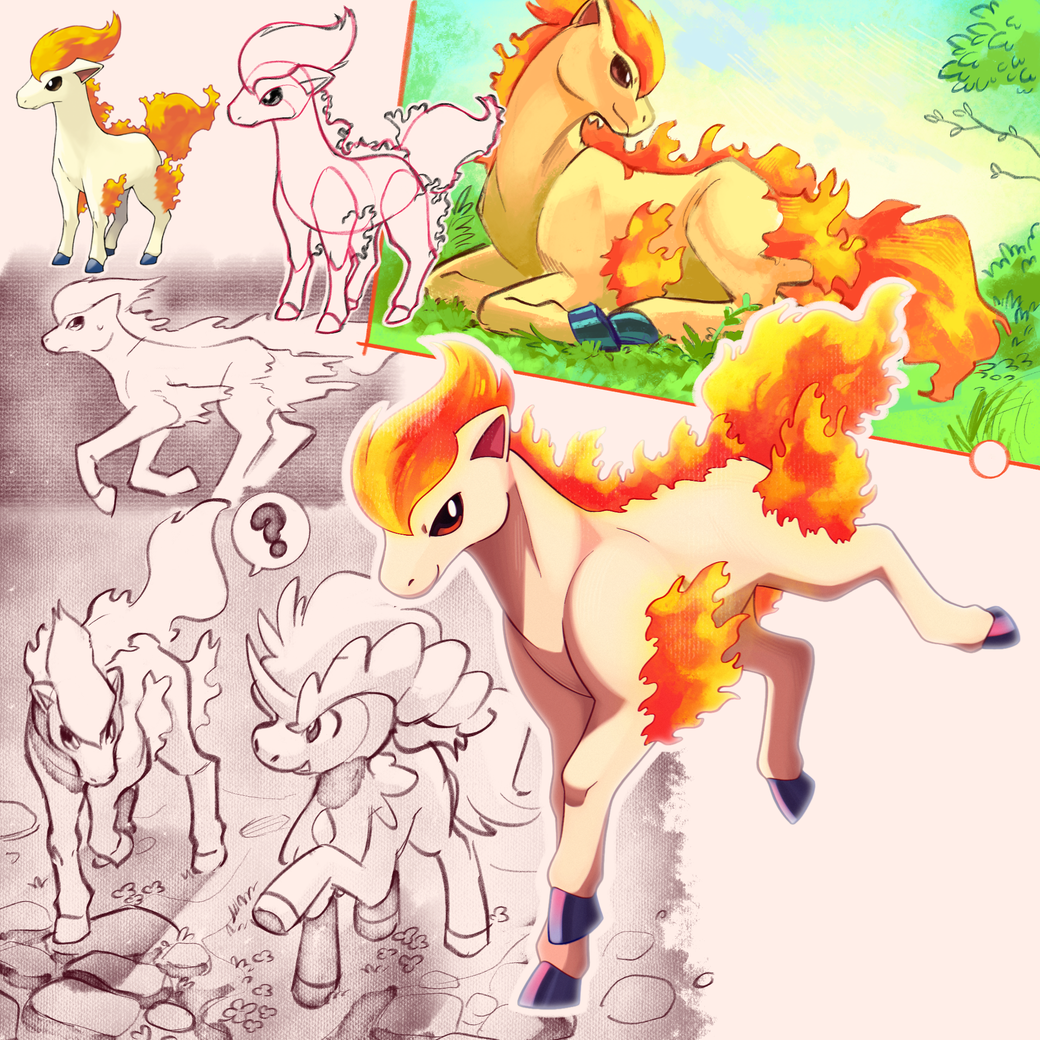 ? commentary_request fiery_tail fire gen_1_pokemon gen_5_pokemon grass highres hooves horns horse keldeo legendary_pokemon mythical_pokemon nintendo no_humans pokemon pokemon_(creature) pokemon_focus pokemon_firered_and_leafgreen ponyta shoupitsuki single_horn sketch tail unicorn