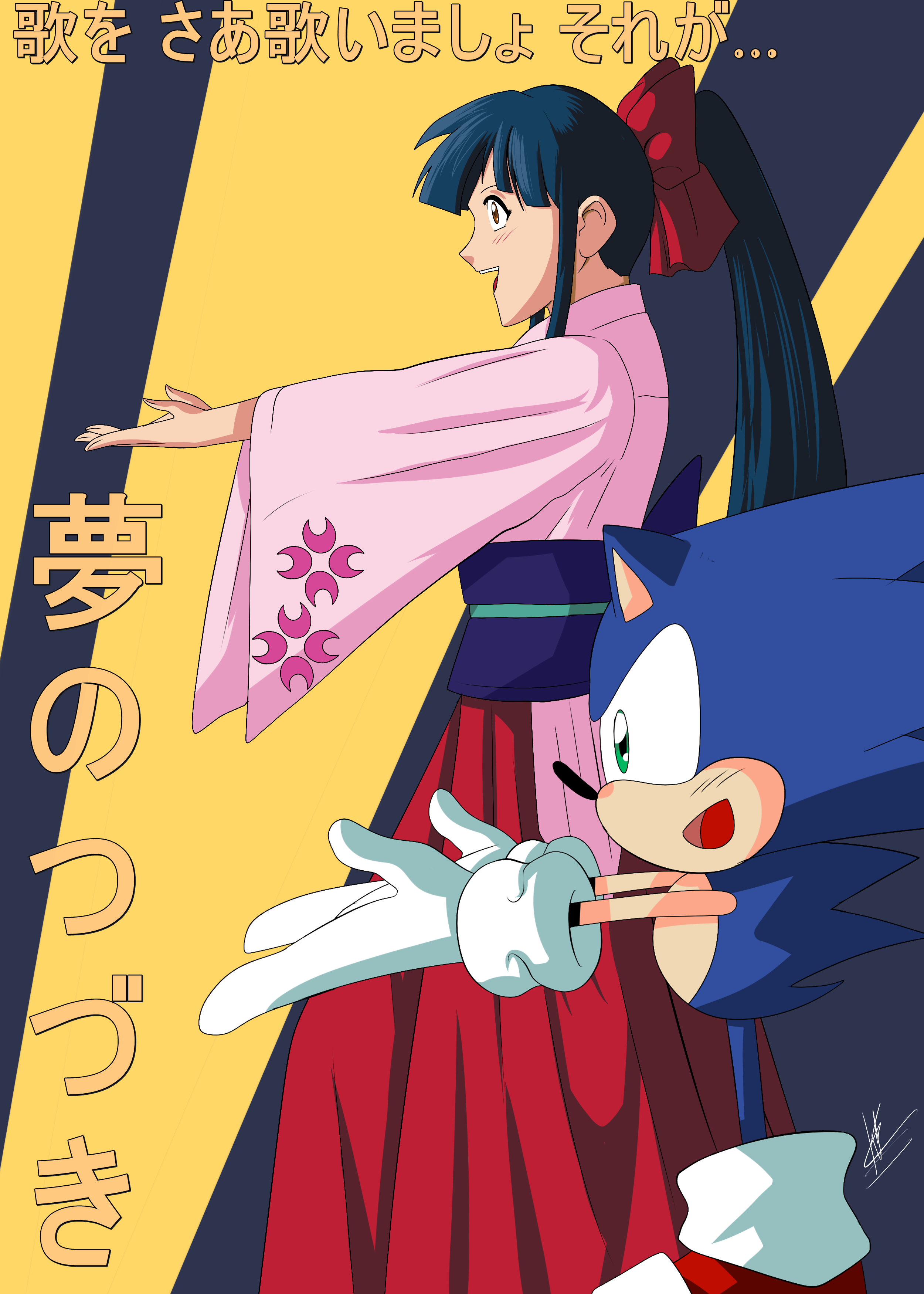 1boy 1girl artist_name blue_hair blush bow brown_eyes cherry_blossoms crossover fingerless_gloves gloves green_eyes hair_ribbon highres japanese_clothes legs long_hair long_skirt looking_at_viewer open_mouth outstretched_arms ponytail red_bow ribbon sakura_taisen sega shinguuji_sakura shinzankuro skirt smile sonic_(series) sonic_the_hedgehog teeth thighs tongue