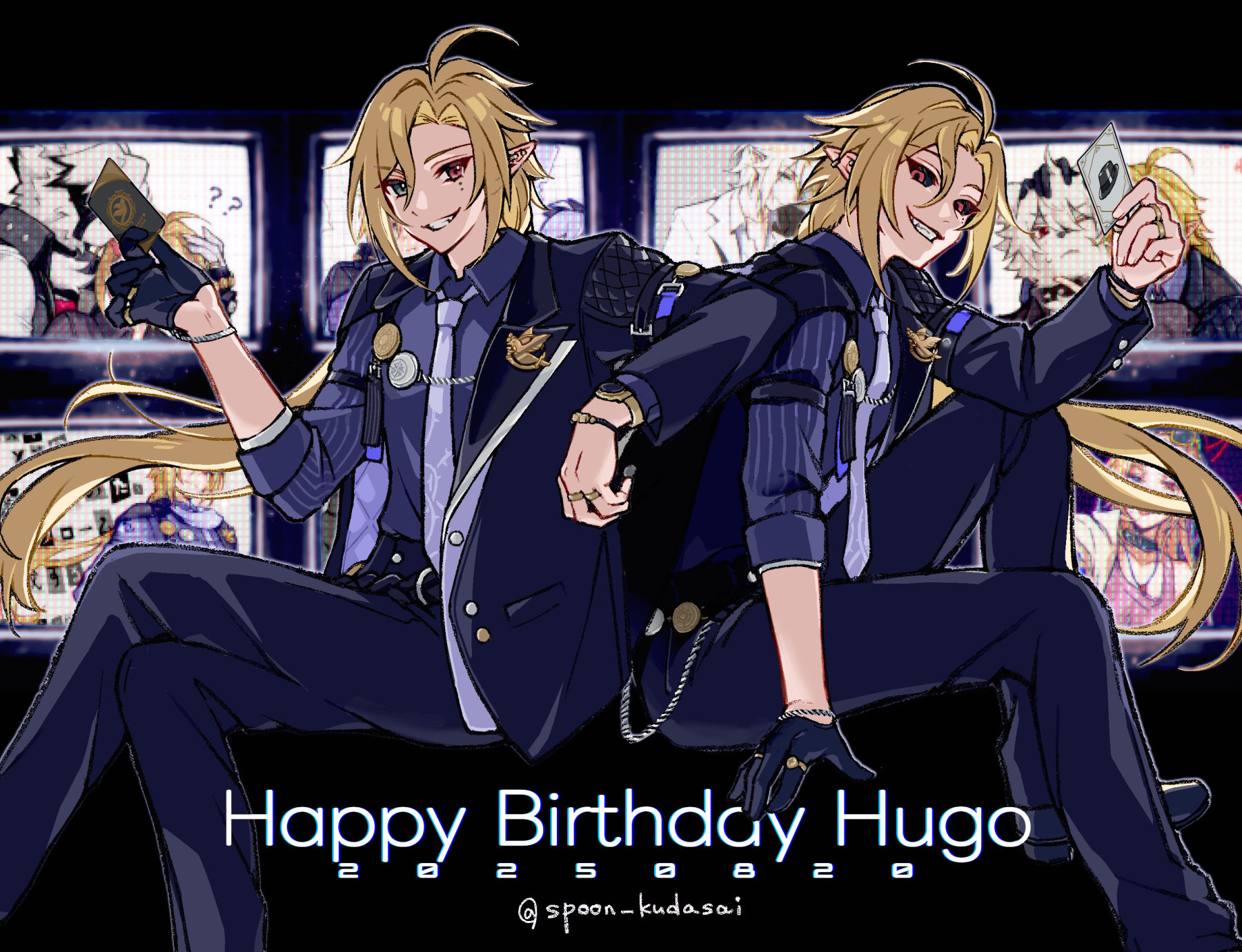 2boys ahoge arm_out_of_sleeve artist_name belt black_belt black_gloves black_jacket black_pants black_sclera black_shoes blonde_hair bracelet card chain character_name collared_shirt colored_sclera commentary crossed_legs crt dark_persona dated dual_persona ear_piercing fangs floating_hair gloves gold_ring grey_eyes grin hair_between_eyes half_gloves hand_up happy_birthday heterochromia highres holding holding_card hugo_vlad jacket jewelry knee_up lapel_pin lapels long_hair long_sleeves looking_at_viewer low_ponytail male_focus mole mole_under_eye multiple_boys multiple_rings necktie open_clothes open_jacket pants parted_bangs piercing playing_card pointy_ears ponytail purple_necktie purple_shirt red_eyes ring shirt shoes single_glove sitting smile teeth television three-quarter_sleeves twitter_username untranslatable_commentary very_long_hair von_lycaon wallet_chain washidake watch wing_collar wristwatch zenless_zone_zero