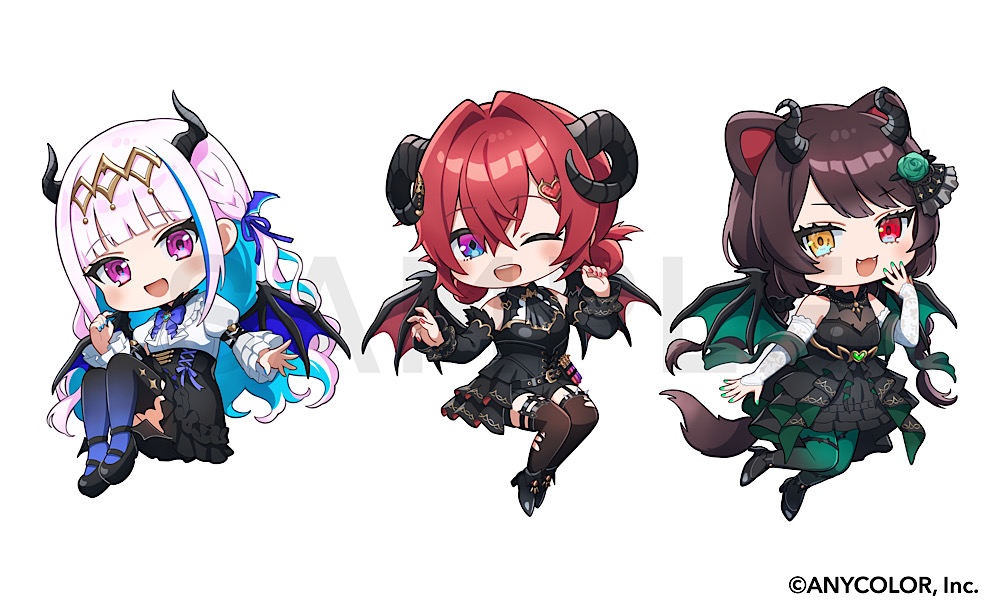 3girls :d ange_katrina animal_ears ankle_strap ascot bare_shoulders belt black_ascot black_belt black_corset black_dress black_horns black_shirt black_shoes black_shorts black_skirt black_sleeves black_thighhighs blue_bow blue_bowtie blue_eyes blue_hair blue_nails blue_thighhighs blue_wings blush bow bowtie braid brown_hair brown_tail brown_thighhighs colored_inner_hair commentary_request copyright_notice corset curled_horns demon_girl demon_horns demon_wings detached_sleeves dog_ears dog_girl dog_tail double_bun dress fangs flower frilled_dress frilled_shirt frilled_skirt frills garter_straps gradient_eyes gradient_thighhighs green_dress green_flower green_nails green_pantyhose green_wings hair_between_eyes hair_bun hair_flower hair_intakes hair_ornament half-skirt hand_up hands_up heart heart_hair_ornament heterochromia high-waist_skirt high_heels horns inui_toko layered_dress lize_helesta long_hair long_sidelocks long_sleeves looking_at_viewer miniskirt multicolored_eyes multicolored_hair multiple_girls nail_polish nijisanji official_alternate_costume official_art one_eye_closed open_mouth pantyhose purple_eyes red_eyes red_hair red_nails red_wings sample_watermark sanbaka_(nijisanji) shinishi_chiho shirt shirt_tucked_in shoes short_dress shorts sidelocks simple_background single_garter_strap skirt sleeveless sleeveless_dress sleeveless_shirt smile spiked_thighhighs streaked_hair tail test_tube test_tube_holster thighhighs torn_clothes torn_thighhighs twin_braids two-sided_dress two-sided_fabric two-tone_hair very_long_hair virtual_youtuber watermark wavy_hair white_background white_hair white_shirt white_sleeves wings yellow_eyes