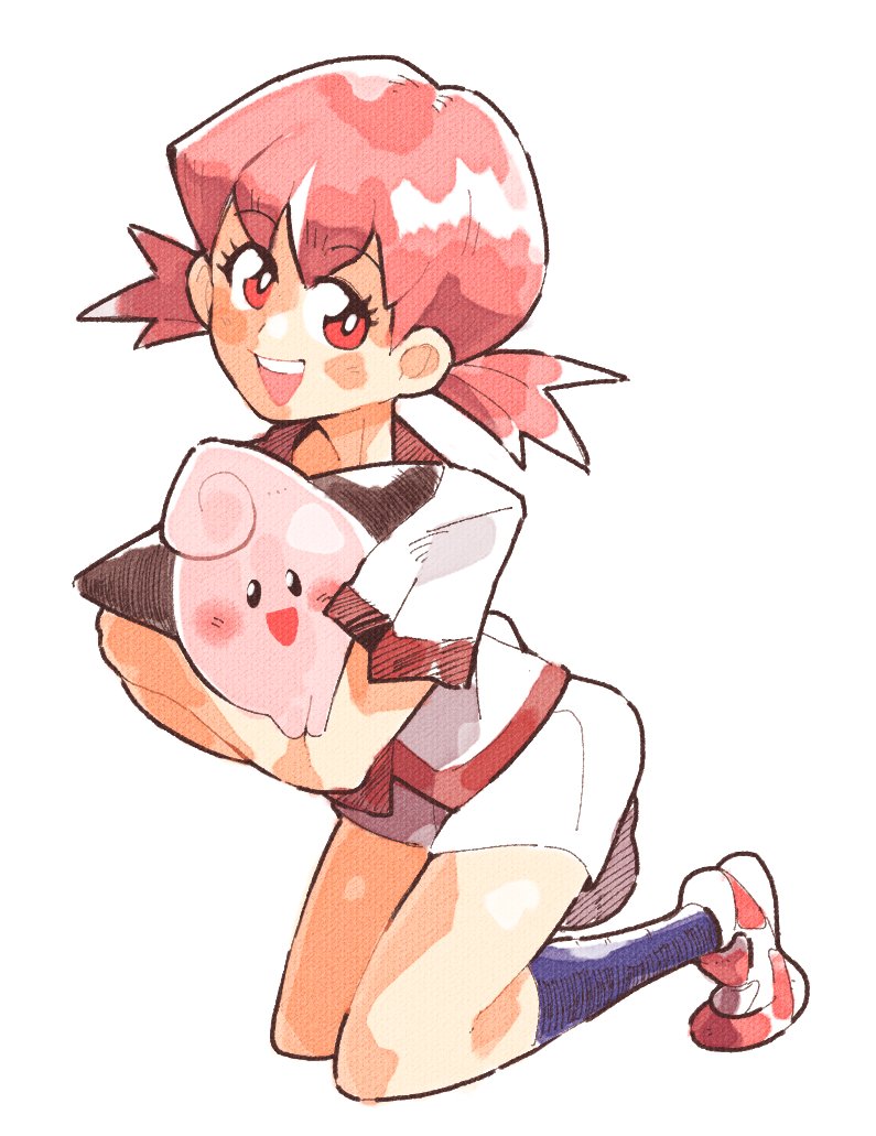 1girl cleffa full_body gen_2_pokemon holding holding_pokemon inkerton-kun kneehighs kneeling looking_at_viewer nintendo open_mouth pink_hair pokemon pokemon_(creature) pokemon_gold/silver/crystal red_eyes shirt short_sleeves shorts smile socks solo_focus teeth twintails upper_teeth_only white_shirt white_shorts whitney_(pokemon)