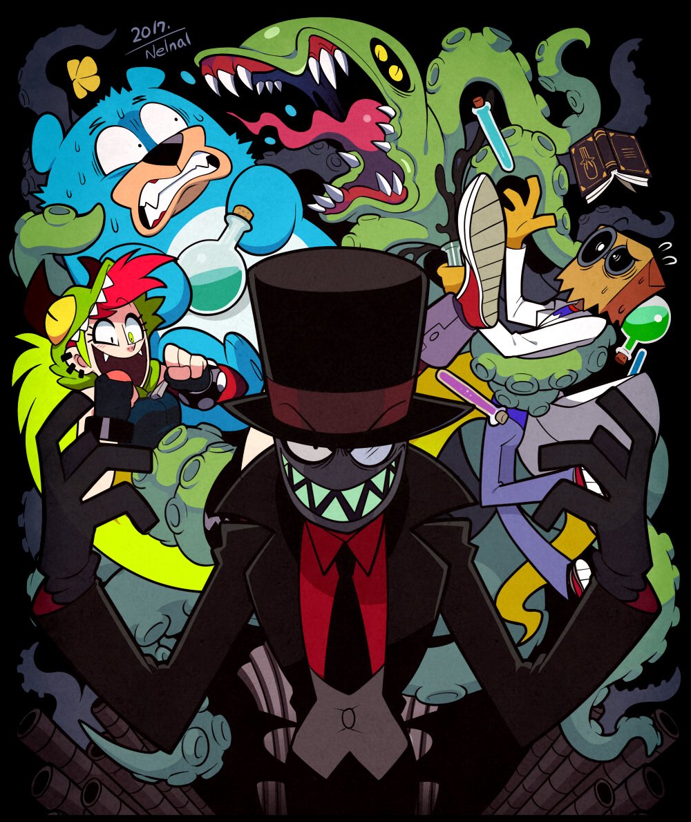 2017 3boys 5.0.5. artist_name bag_on_head bear black_coat black_gloves black_hat black_hat_(villainous) black_necktie buttons coat collared_shirt colored_skin commentary demencia dr._flug fangs gloves green_hair grey_skin grin hands_up hat looking_at_viewer monocle monster multicolored_hair multiple_boys necktie nelnal open_clothes open_coat open_mouth red_hair red_shirt sharp_teeth shirt smile split-color_hair standing teeth test_tube tongue tongue_out top_hat untranslatable_commentary villainous