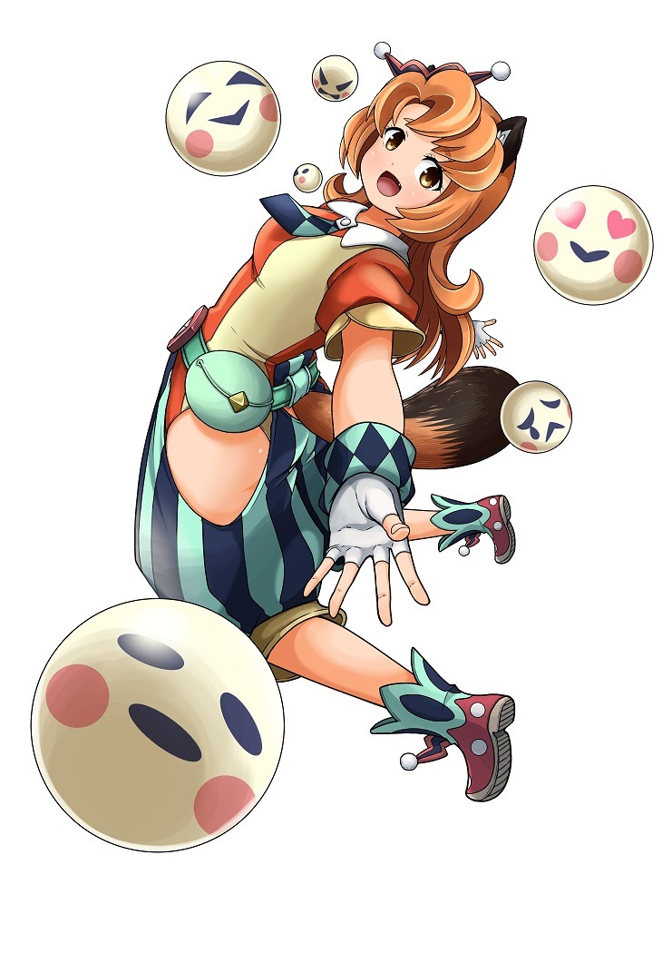 1girl :d animal_ear_fluff animal_ears ball belt belt_pouch blush boots breasts brown_eyes brown_hair clothing_cutout collared_shirt commentary_request fang fingerless_gloves from_side full_body futoku_no_guild gloves leaning_back long_hair looking_at_viewer magyo medium_breasts necktie official_art open_hands open_mouth outstretched_arms pouch puffy_short_sleeves puffy_sleeves pumpuku_chanoma raccoon_ears raccoon_girl raccoon_tail shirt short_sleeves shorts side_cutout simple_background smile solo spread_arms striped_clothes striped_shorts tail tareme white_background white_gloves