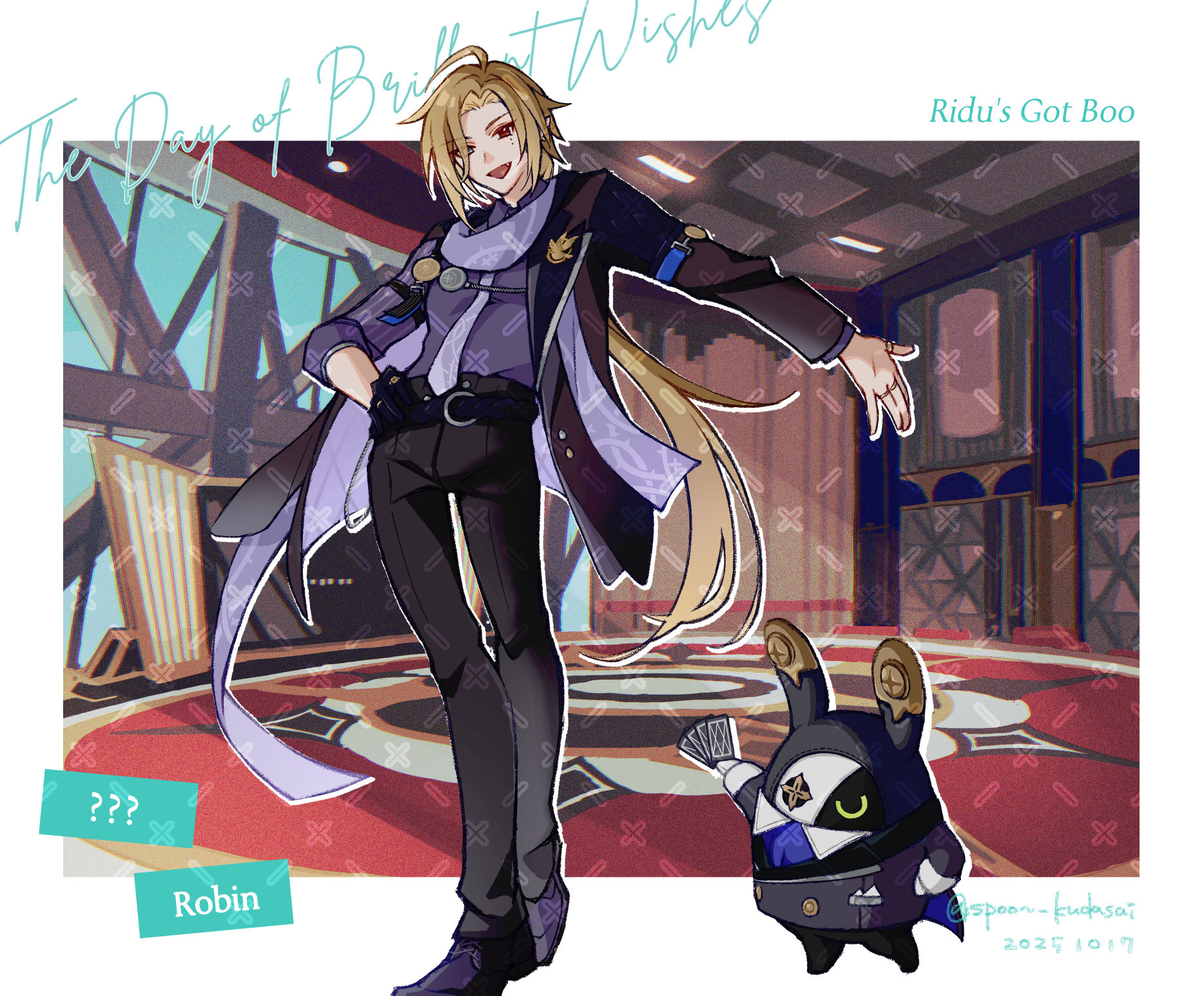 1boy :d ahoge arm_out_of_sleeve artist_name bangboo_(zenless_zone_zero) belt black_belt black_gloves black_jacket black_pants black_shoes blonde_hair border chain character_name collared_shirt commentary_request dated english_text fang gloves gold_ring grey_eyes hair_between_eyes hand_on_own_hip heterochromia highres hugo_vlad jacket jewelry lapel_pin lapels long_hair long_sleeves looking_at_viewer low_ponytail male_focus mole mole_under_eye multiple_rings necktie open_clothes open_jacket open_mouth outside_border outstretched_arm pants parted_bangs pointy_ears ponytail purple_necktie purple_scarf purple_shirt red_eyes ring robin_(zenless_zone_zero) scarf shirt shoes single_glove smile solo standing three-quarter_sleeves thumb_ring twitter_username very_long_hair wallet_chain washidake white_border window wing_collar zenless_zone_zero
