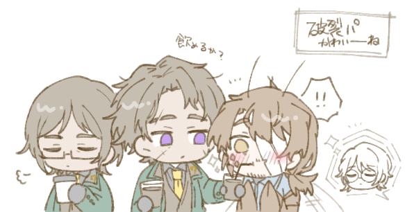 ! !! 2boys 2girls absurdres ahoge antennae arthropod_boy arthropod_limbs bandage_on_face bandage_over_one_eye bandaged_head bandages beard_stubble black_gloves black_shirt blue_jacket blush brown_hair brown_vest bug chibi closed_eyes closed_mouth cockroach cockroach_boy coffee collared_shirt cup disposable_cup drink drinking drinking_glass drinking_straw extra_wings facial_hair facial_scar faust_(project_moon) formal_clothes four_wings g_corp._(identity)_(project_moon) glasses gloves green_jacket gregor's_cockroach_(project_moon) gregor_(project_moon) heathcliff_(project_moon) highres holding holding_cup insect insect_on_head insect_wings jacket japanese_clothes lily26983455 limbus_company long_hair low_ponytail male_focus monster_boy motion_lines multiple_boys multiple_girls multiple_views multiple_wings necktie notice_lines one_eye_covered outis_(project_moon) parted_bangs ponytail project_moon puff_of_air purple_eyes round_eyewear scar scar_on_cheek scar_on_face seven_association_south_uniform shirt short_hair simple_background sleeves_rolled_up sparkle speech_bubble spoken_exclamation_mark stubble turtleneck turtleneck_shirt upper_body vest white_background wings yellow_eyes yellow_necktie
