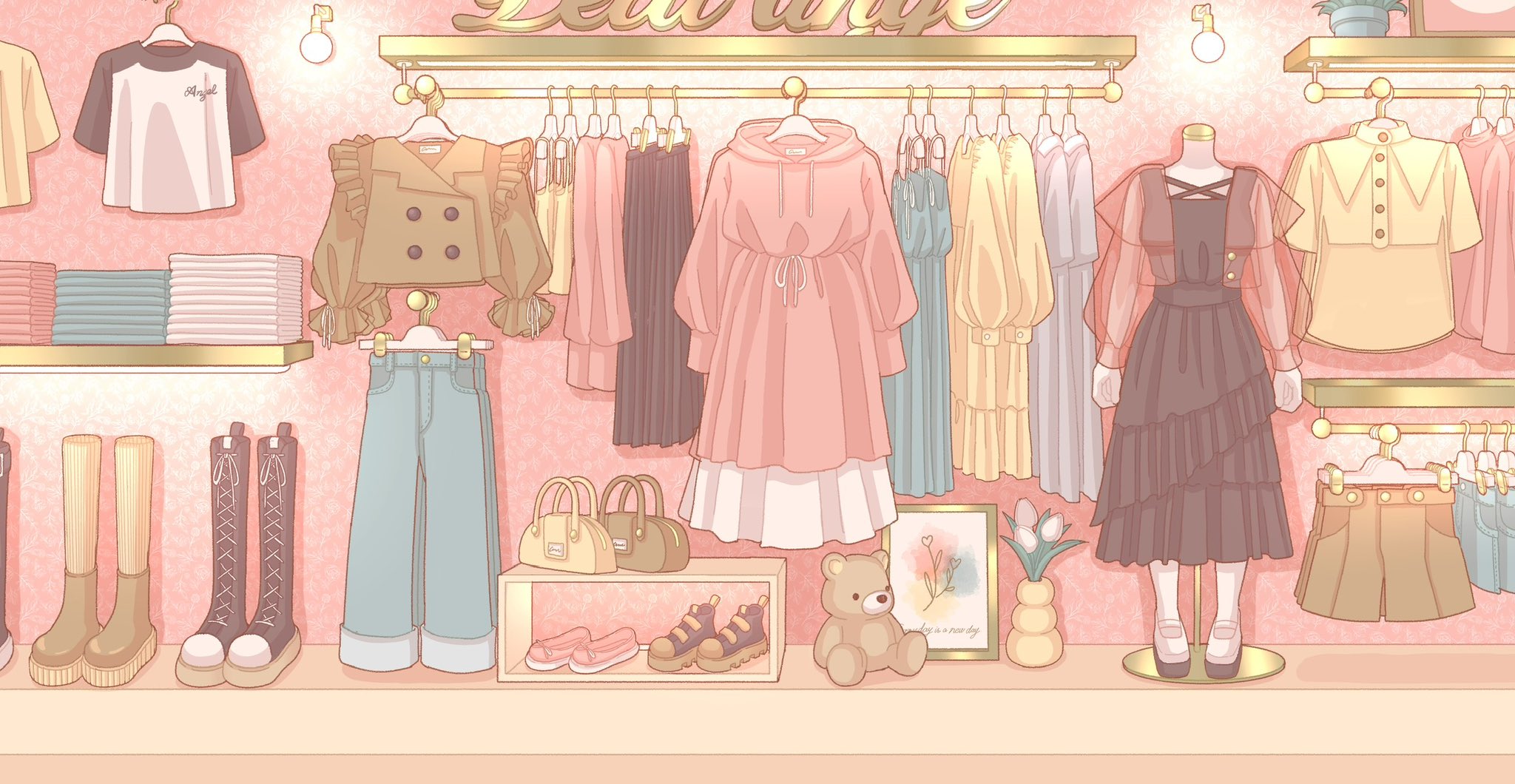 absurdly_detailed_composition bag black_boots black_dress black_sleeves boots brown_bag brown_cardigan brown_shorts cardigan clothes_hanger collared_shirt commentary_request denim denim_shorts dress flower frilled_cardigan green_dress grey_dress handbag highres hooded_dress indoors jeans long_sleeves nekomaru0817 orange_shoes original pants pastel_colors picture_frame pink_dress pink_flower pink_shirt pink_shoes pink_tulip scenery see-through_clothes see-through_sleeves shirt shoes shorts stuffed_animal stuffed_toy t-shirt teddy_bear tulip unworn_clothes vase wall_lamp white_flower white_shirt white_shoes white_tulip yellow_bag yellow_boots yellow_shirt