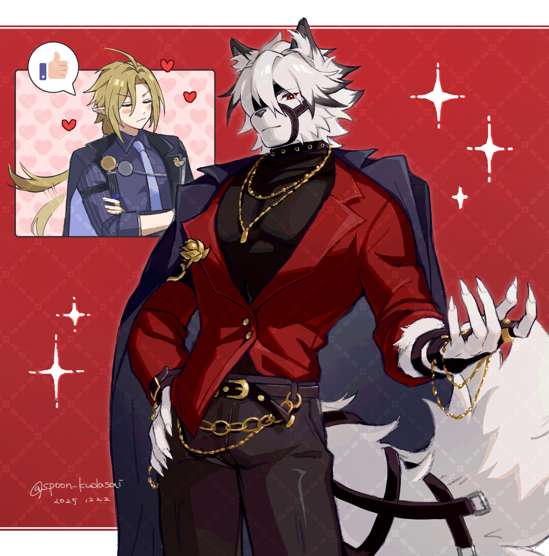 2boys ahoge animal_ear_fluff animal_ears arm_out_of_sleeve artist_name belt belt_buckle black_belt black_choker black_coat black_jacket black_shirt black_streaks blonde_hair blush_stickers buckle chain choker claws closed_eyes closed_mouth coat coat_on_shoulders collared_shirt commentary_request cowboy_shot crossed_arms dated eyepatch furry furry_male gold_chain gold_necklace hair_between_eyes heart highres hugo_vlad jacket jewelry lapel_pin lapels large_pectorals long_hair long_sleeves looking_at_viewer low_ponytail male_focus mole mole_under_eye multicolored_hair multiple_boys muzzle_(mask) necklace necktie official_alternate_costume one_eye_covered open_clothes open_jacket parted_bangs pectorals pointy_ears ponytail purple_shirt red_background red_eyes red_jacket shirt short_hair smile sparkle speech_bubble spoken_thumbs_up standing streaked_hair studded_belt studded_choker tail tail_belt thumbs_up_emoji twitter_username very_long_hair von_lycaon wallet_chain washidake white_hair white_necktie wing_collar wolf_boy wolf_ears wolf_tail zenless_zone_zero