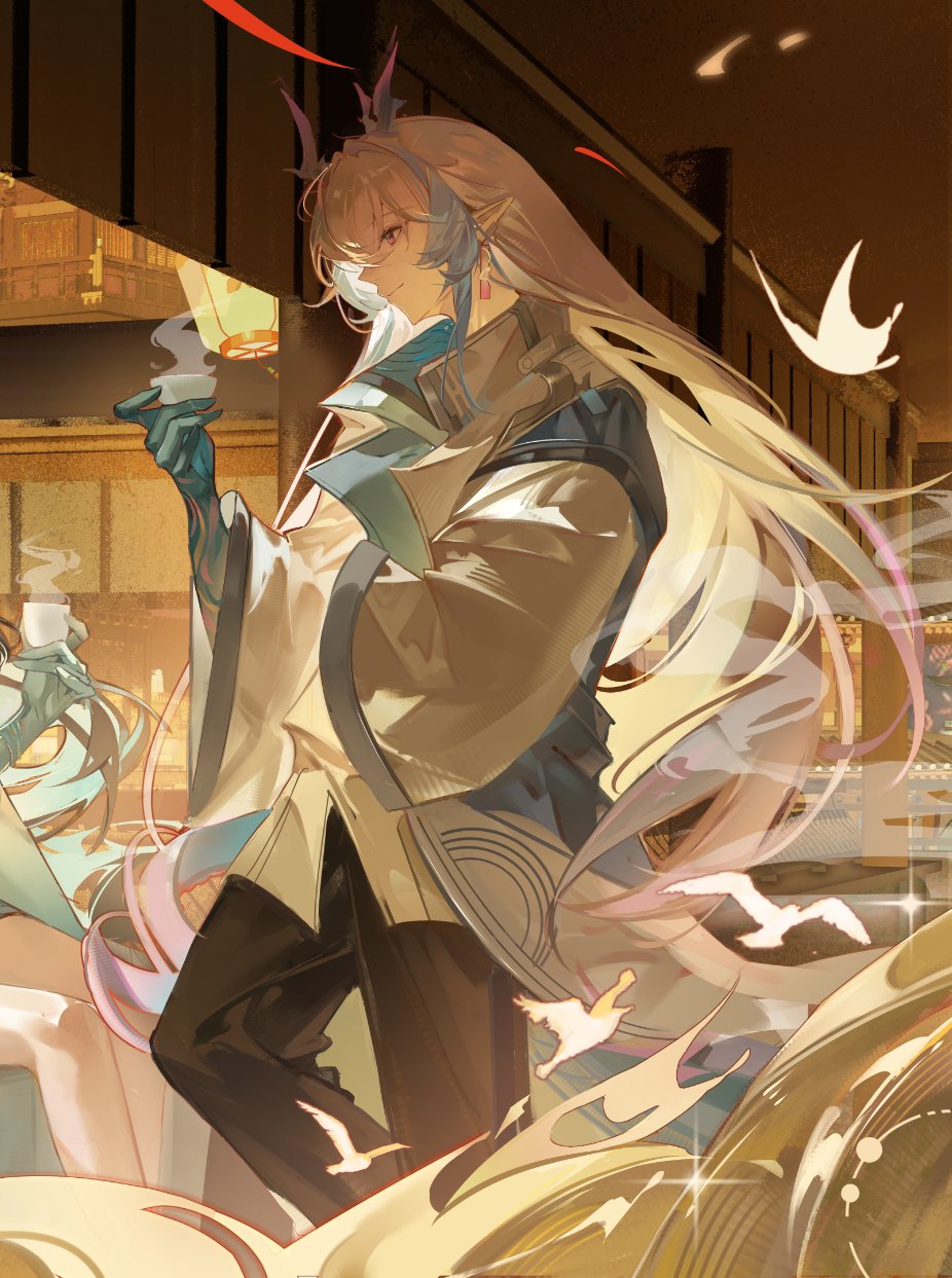 1boy 1other arknights black_pants blue_hair coat commentary_request cup dragon_boy dragon_horns dragon_tail highres holding holding_cup horns indoors lantern long_hair looking_to_the_side male_focus multicolored_hair pants pink_eyes pink_hair smile smoke solo standing standing_on_one_leg streaked_hair tail teacup white_coat yi_(arknights) yuki_sweet_tea