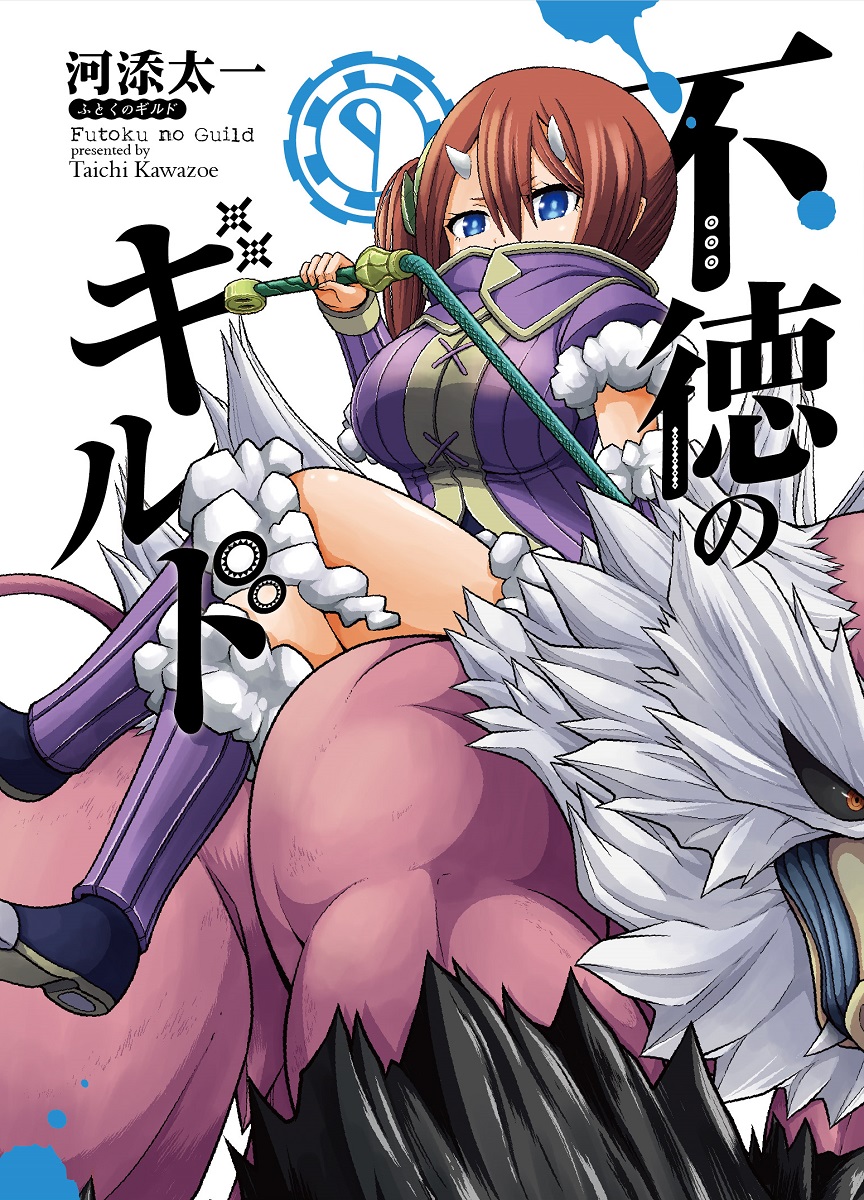 1girl arm_guards artist_name blue_eyes boots breasts brown_hair commentary_request copyright_name cover cover_page crossed_legs from_below full_body fur-trimmed_jacket fur_trim futoku_no_guild hair_between_eyes highres holding holding_weapon holding_whip horns huge_breasts jacket long_hair magyo manga_cover monster official_art purple_jacket san_hoshi shin_guards short_sleeves side_ponytail simple_background sitting_on_animal thighs title weapon whip white_background