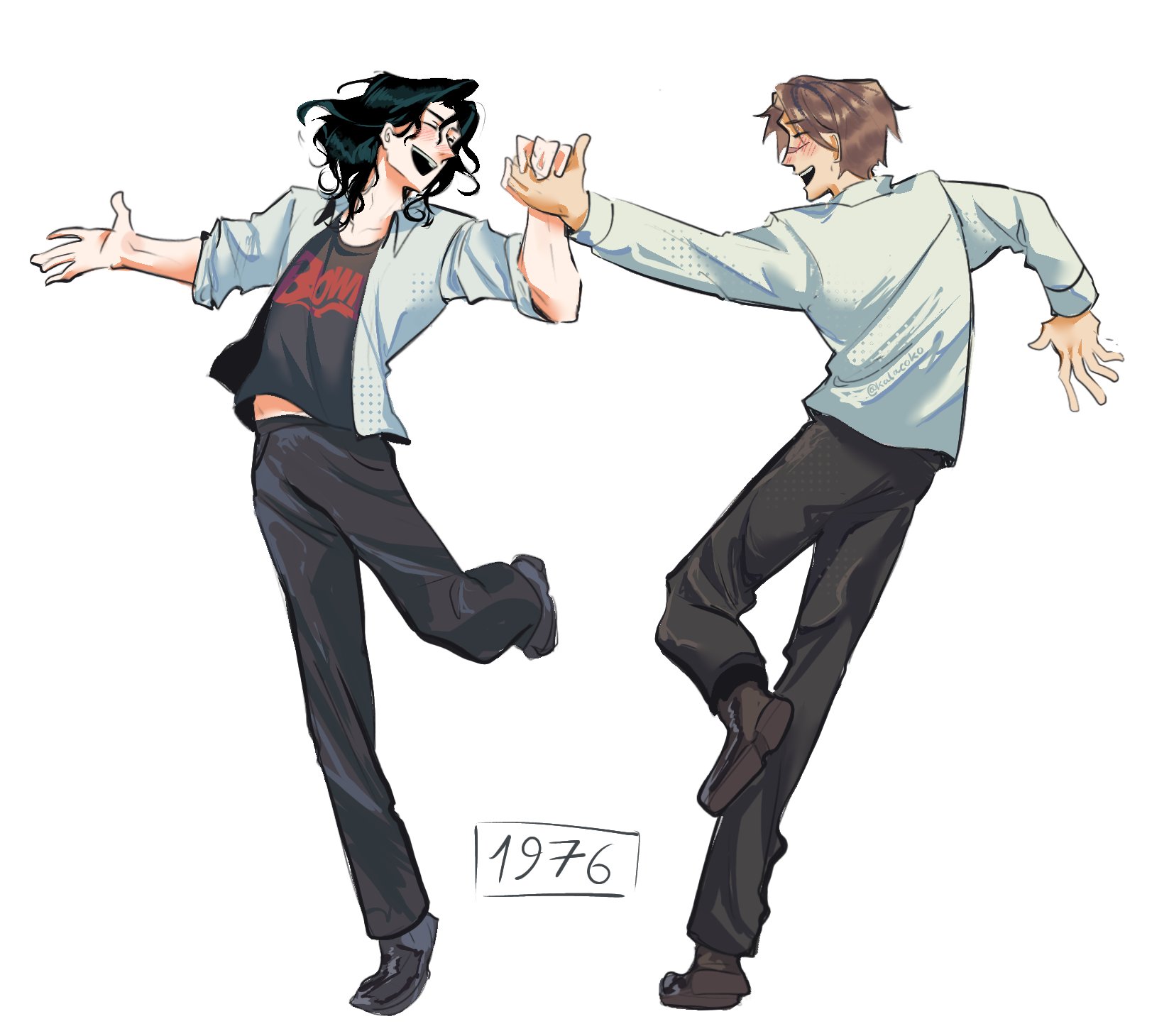 2boys black_hair blush brown_hair closed_eyes collar collarbone dancing floating_clothes full_body harry_potter_(series) holding_hands kalacoko male_focus medium_hair midriff_peek multiple_boys open_mouth profile remus_lupin scar scar_on_face scar_on_nose shirt short_hair simple_background sirius_black t-shirt teeth twitter_username upper_teeth_only white_background wing_collar wizarding_world yaoi