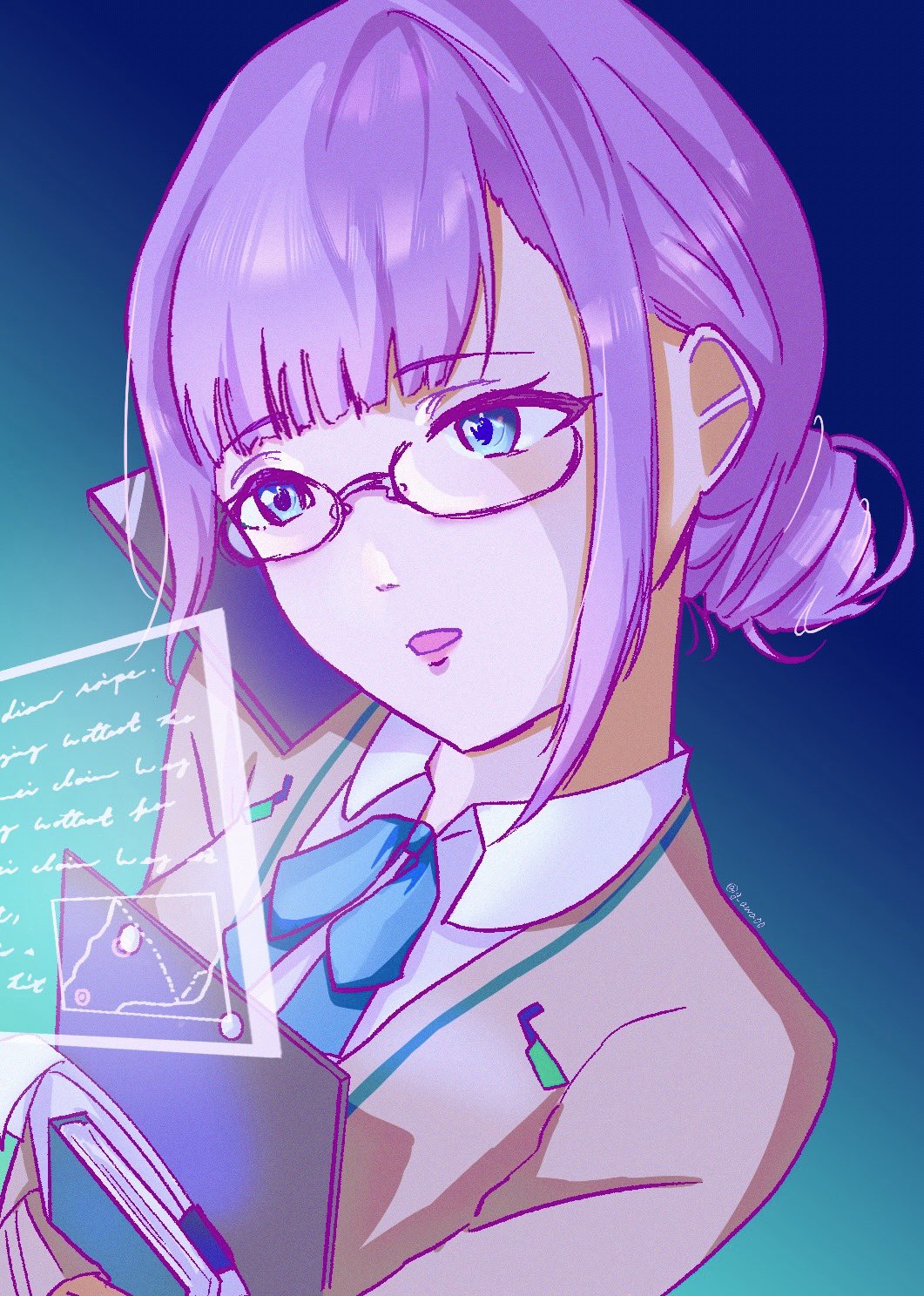 1girl blue_bow blue_bowtie blue_eyes book bow bowtie clipboard commentary_request g_awa00 glasses hair_bun heaven_burns_red highres higuchi_seika holding holding_book holding_clipboard purple_hair school_uniform short_hair
