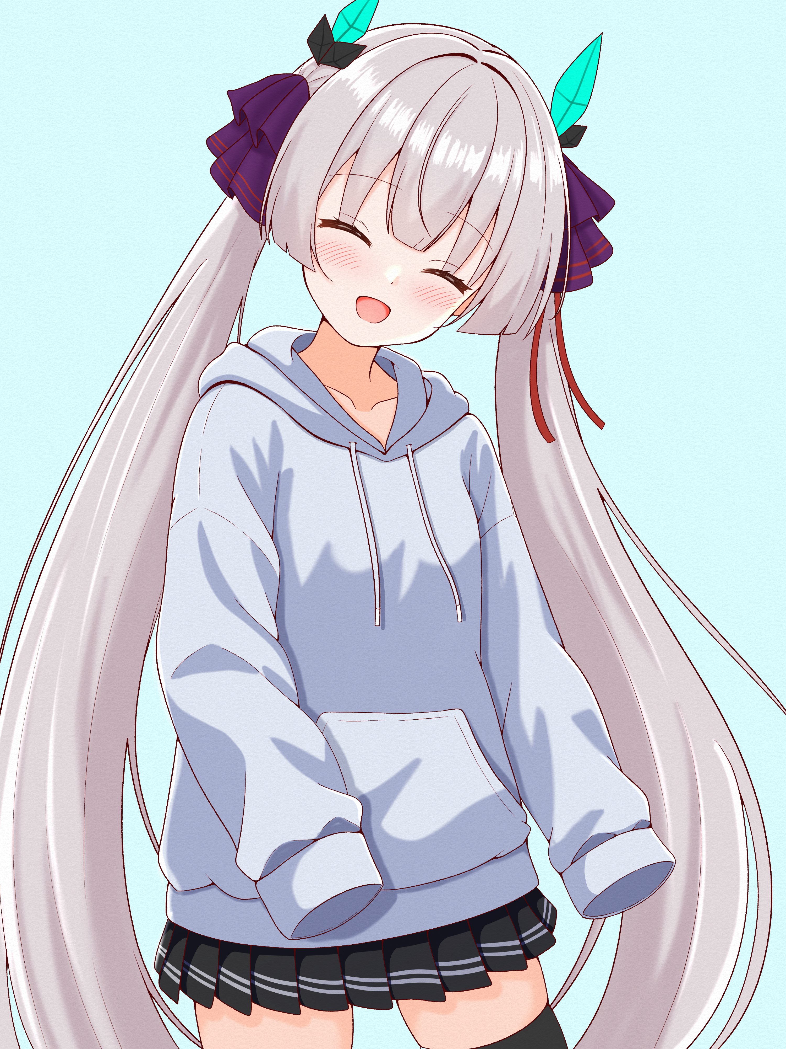 1girl :d ^_^ absurdres alternate_costume aqua_background black_skirt black_thighhighs blunt_bangs blunt_ends blush brown_hair casual closed_eyes collarbone cowboy_shot facing_viewer fake_horns grey_hoodie hair_ribbon happy heaven_burns_red highres hime_cut hood hood_down hoodie horns long_hair luck_hebuban miniskirt ogasahara_hisame open_mouth oversized_clothes pleated_skirt purple_ribbon ribbon sidelocks simple_background skirt sleeves_past_fingers sleeves_past_wrists smile solo straight_hair thighhighs twintails very_long_hair zettai_ryouiki