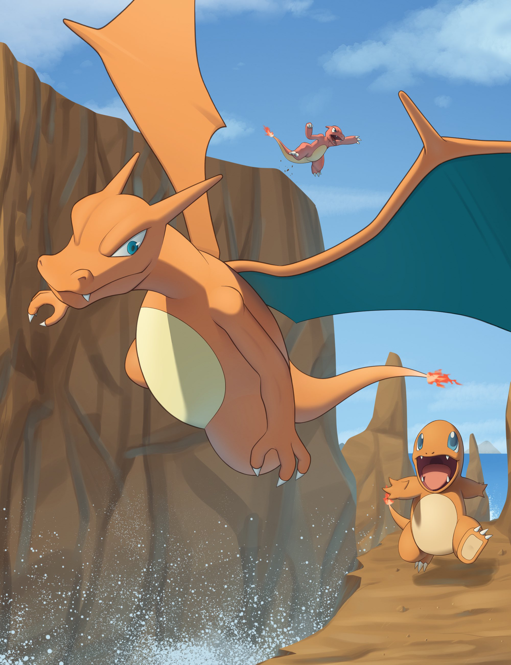 absurdres blue_sky charizard charmander charmeleon claws closed_mouth cloud commentary_request dragon evolutionary_line fangs fire flame-tipped_tail flying gen_1_pokemon highres jumping kihada_magulo nintendo no_humans open_mouth outdoors pokemon pokemon_(creature) pokemon_focus running sky smile tail water