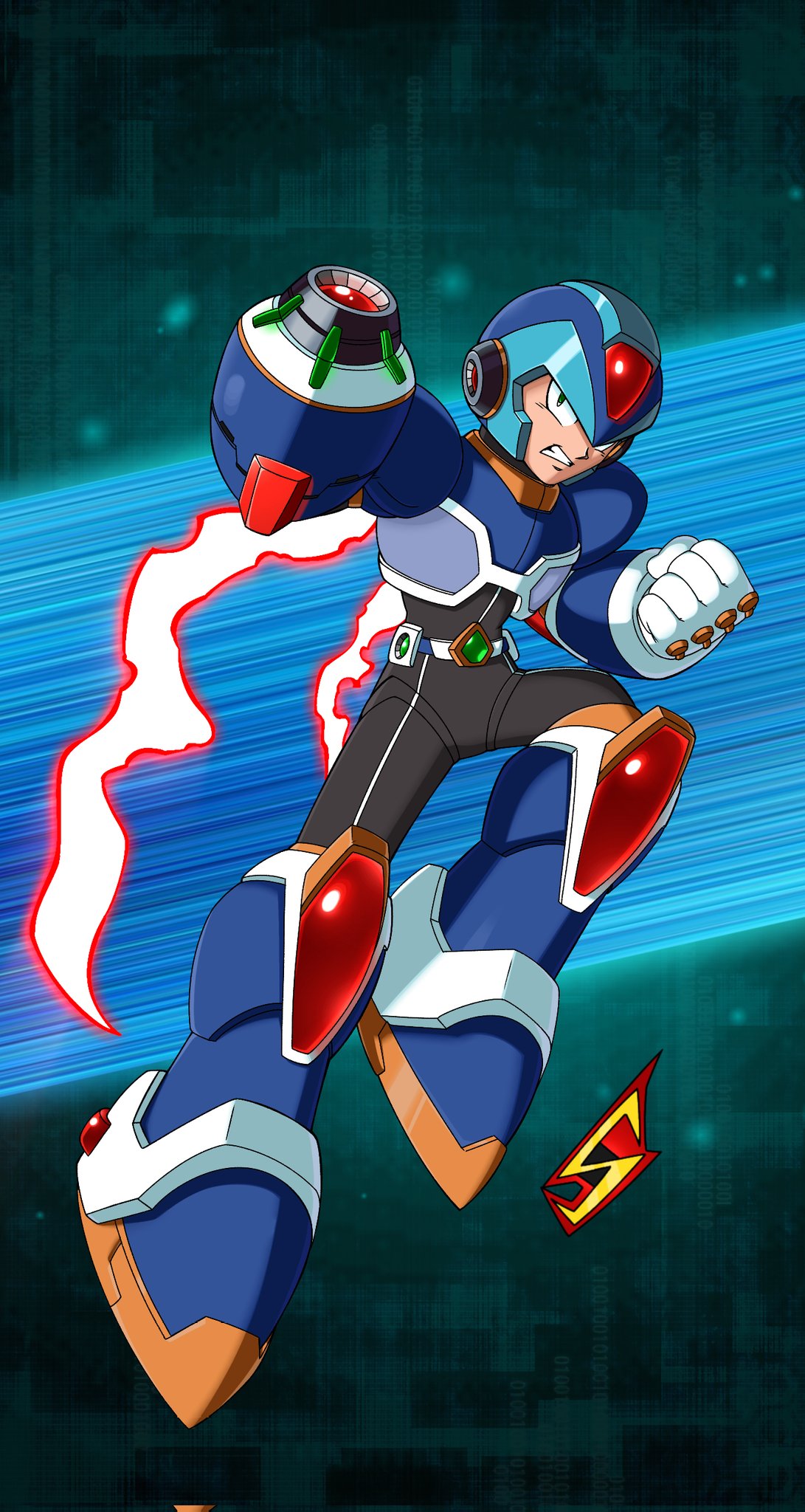 1boy android arm_cannon armor artist_logo blue_armor blue_helmet clenched_hand clenched_teeth energy_cape forehead_jewel full_body green_eyes helmet highres iridescent_clothes jewelry logo looking_at_viewer mega_man_(series) mega_man_x:_command_mission mega_man_x_(series) new_armor_x_(mega_man) one_eye_covered red_scarf robot scarf solo strike_sketch teeth weapon x_(mega_man)