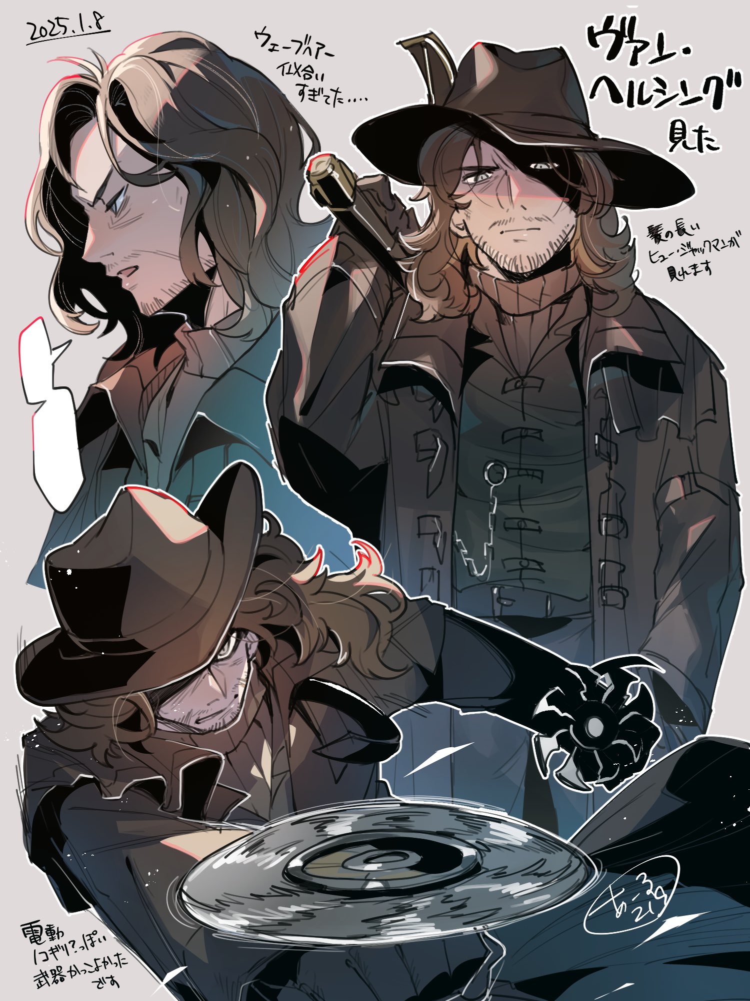 1boy beard black_coat black_gloves black_hat black_shirt blank_speech_bubble brown_hair clenched_teeth coat commentary_request copyright_name dated dual_wielding facial_hair fighting_stance furrowed_brow gabriel_van_helsing gloves grey_background hat hat_over_one_eye highres holding hugh_jackman looking_at_viewer male_focus medium_hair momoi_housuke multiple_views mustache over_shoulder parted_bangs parted_lips partially_shaded_face ribbed_shirt shirt solo speech_bubble teeth upper_body van_helsing_(movie) weapon weapon_over_shoulder