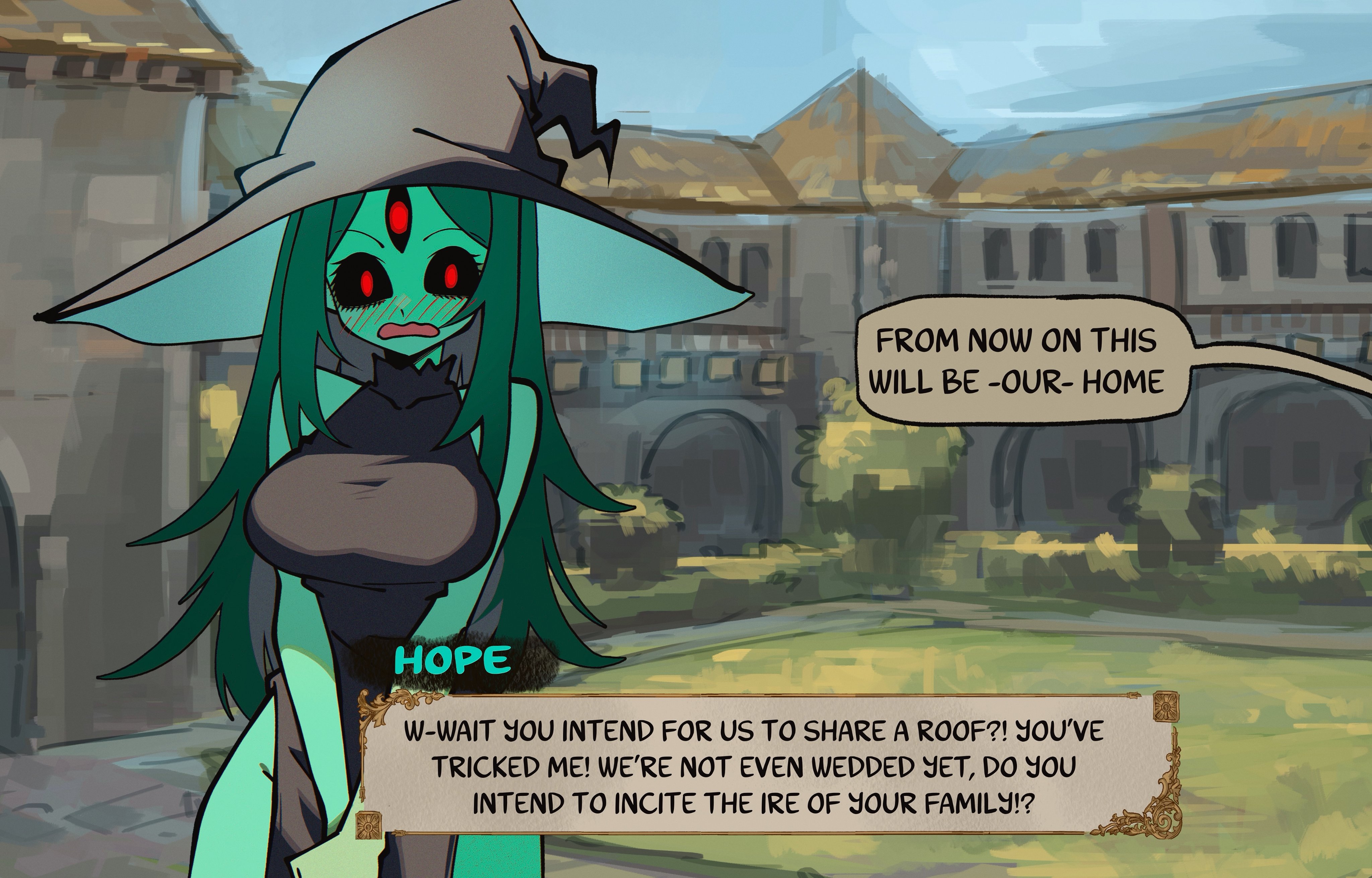 1girl absurdres bare_shoulders basedbinkie black_dress black_hat black_sclera blush breasts chivalry_starved colored_sclera colored_skin cowboy_shot dress english_text green_hair green_skin hat highres hope_(basedbinkie) large_breasts long_hair looking_at_viewer monster_girl open_mouth pelvic_curtain red_eyes slit_pupils smile solo speech_bubble third_eye user_interface very_long_hair video_game_dialogue_box visual_novel witch_hat