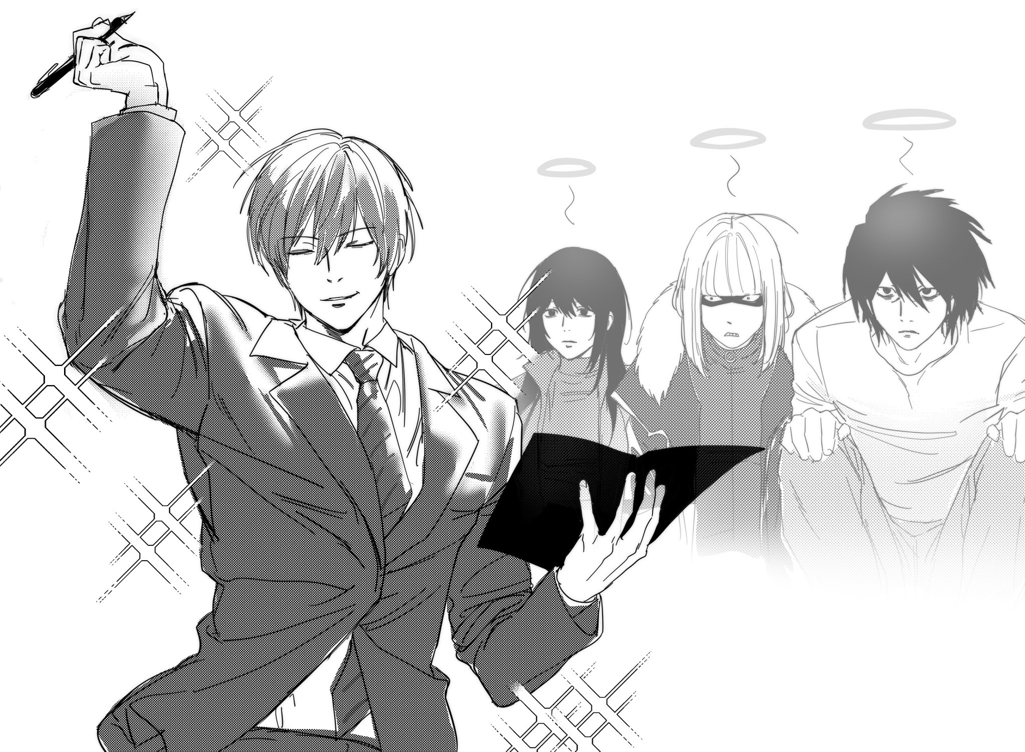 10kira 1girl 3boys annoyed bags_under_eyes black_hair bob_cut closed_eyes collared_shirt death_note death_note_(object) fur-trimmed_jacket fur_trim greyscale hair_between_eyes halo hands_on_own_knees highres holding holding_notebook holding_pen jacket l_(death_note) long_hair medium_hair mello_(death_note) misora_naomi monochrome multiple_boys necktie no_eyebrows notebook pants pen shaded_face shirt short_hair smile sparkle spirit suit_jacket turtleneck white_background white_shirt yagami_light