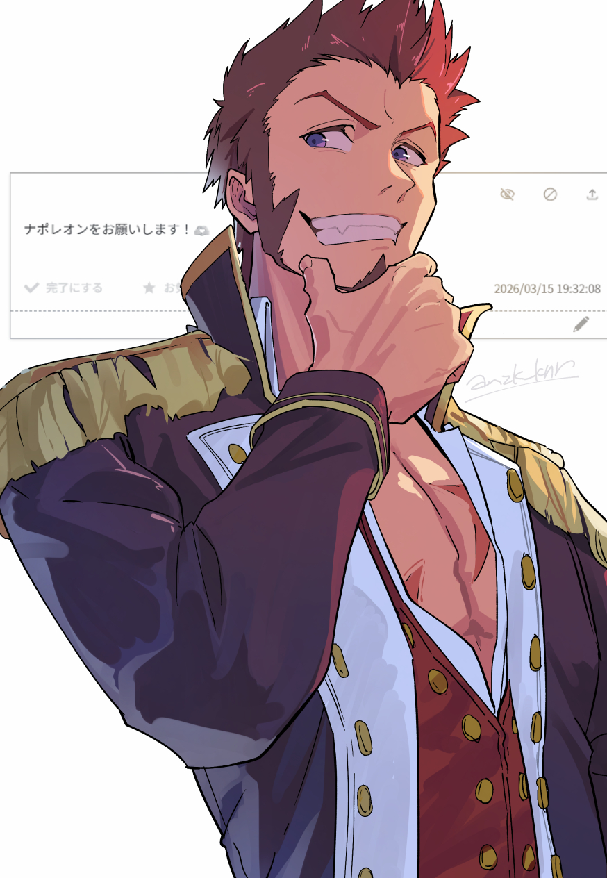 1boy age_nasuo artist_name blue_eyes brown_hair commentary_request cross_scar epaulettes fang grin hand_on_own_chin high_collar highres long_sideburns long_sleeves napoleon_bonaparte_(fate) open_clothes open_shirt request_inset scar scar_on_chest short_hair sideburns sideways_glance smile teeth twitter_username upper_body