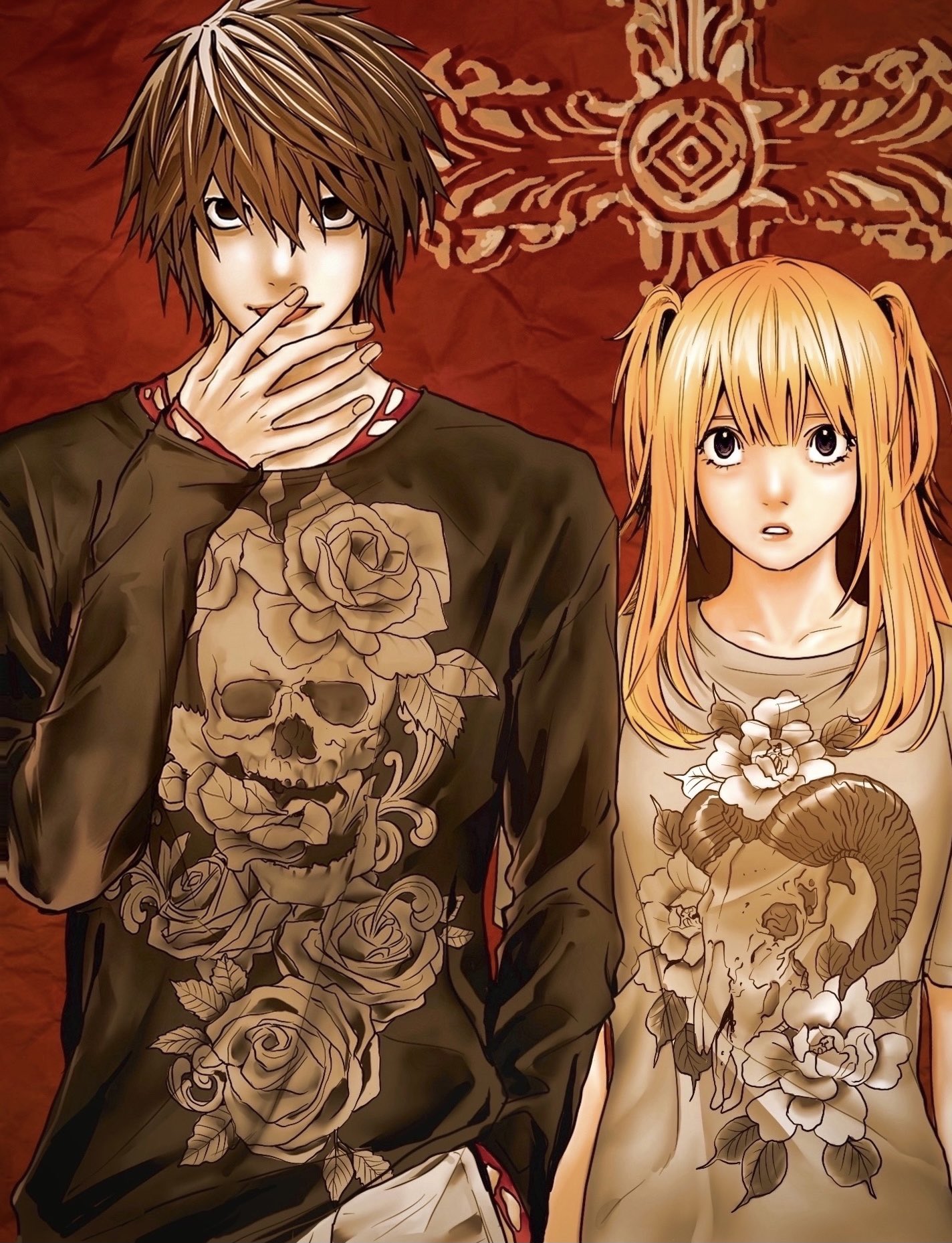 10kira 1boy 1girl amane_misa animal_skull black_eyes black_hair breasts brown_eyes cross death_note floral_print hair_between_eyes hair_over_shoulder half_updo hand_in_pocket highres l_(death_note) licking licking_finger long_sleeves looking_at_viewer medium_breasts no_eyebrows obata_takeshi_(style) pants parted_lips print_shirt ram_skull red_background shirt short_twintails skull_print twintails undershirt upper_body white_pants