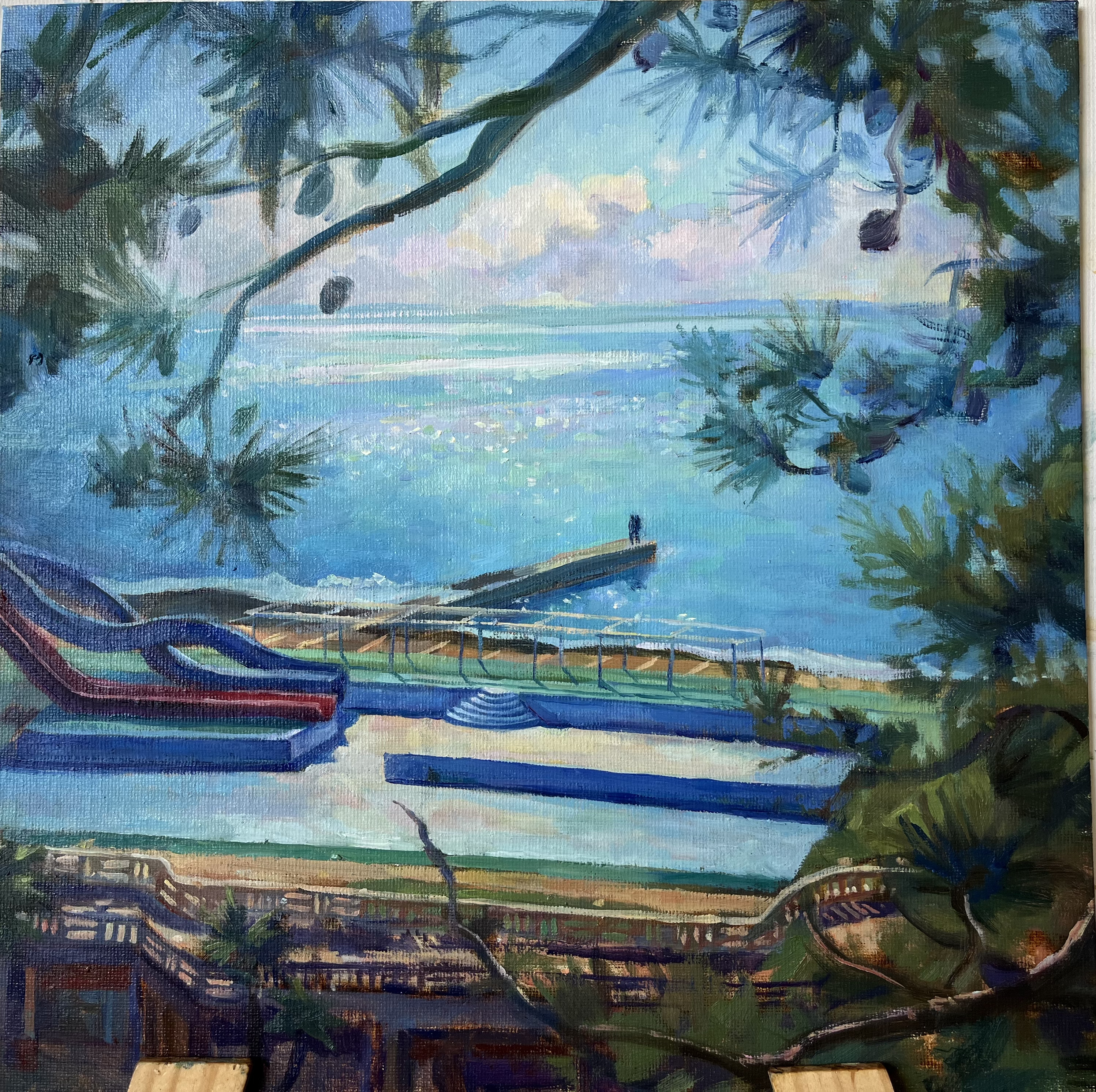 absurdres alina_ivy blue_sky branch commentary day english_commentary highres horizon ocean original outdoors painting_(medium) people photo_(medium) pier scenery sky stairs traditional_media water_slide