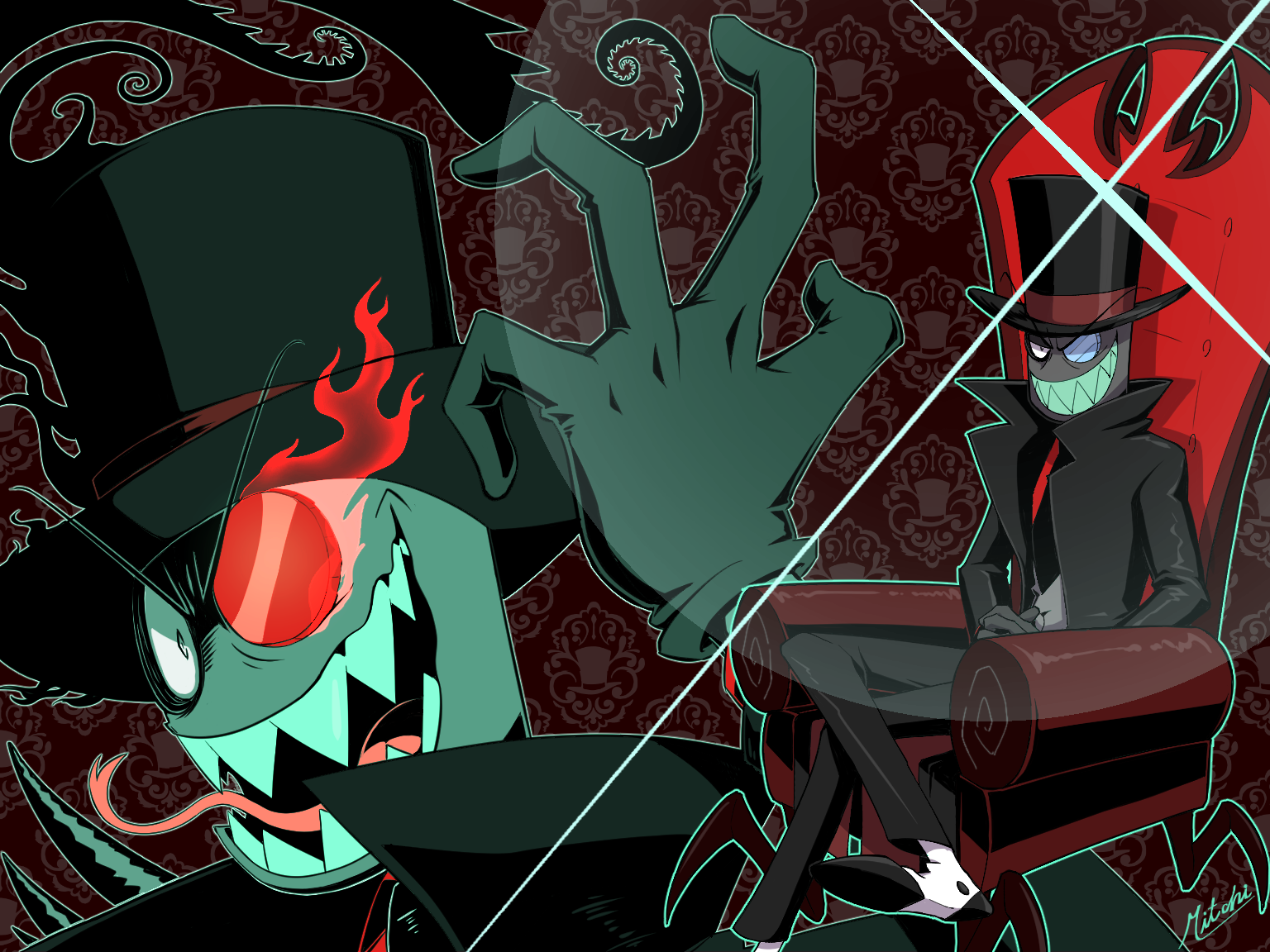 1boy black_coat black_hat black_hat_(villainous) black_necktie chair coat collared_shirt colored_skin commentary_request crossed_legs gloves grey_gloves grey_skin grin hand_up hat laughing male_focus monocle multiple_views necktie nyatarou on_chair open_clothes open_coat open_mouth red_shirt sharp_teeth shirt smile teeth tongue tongue_out top_hat vest villainous