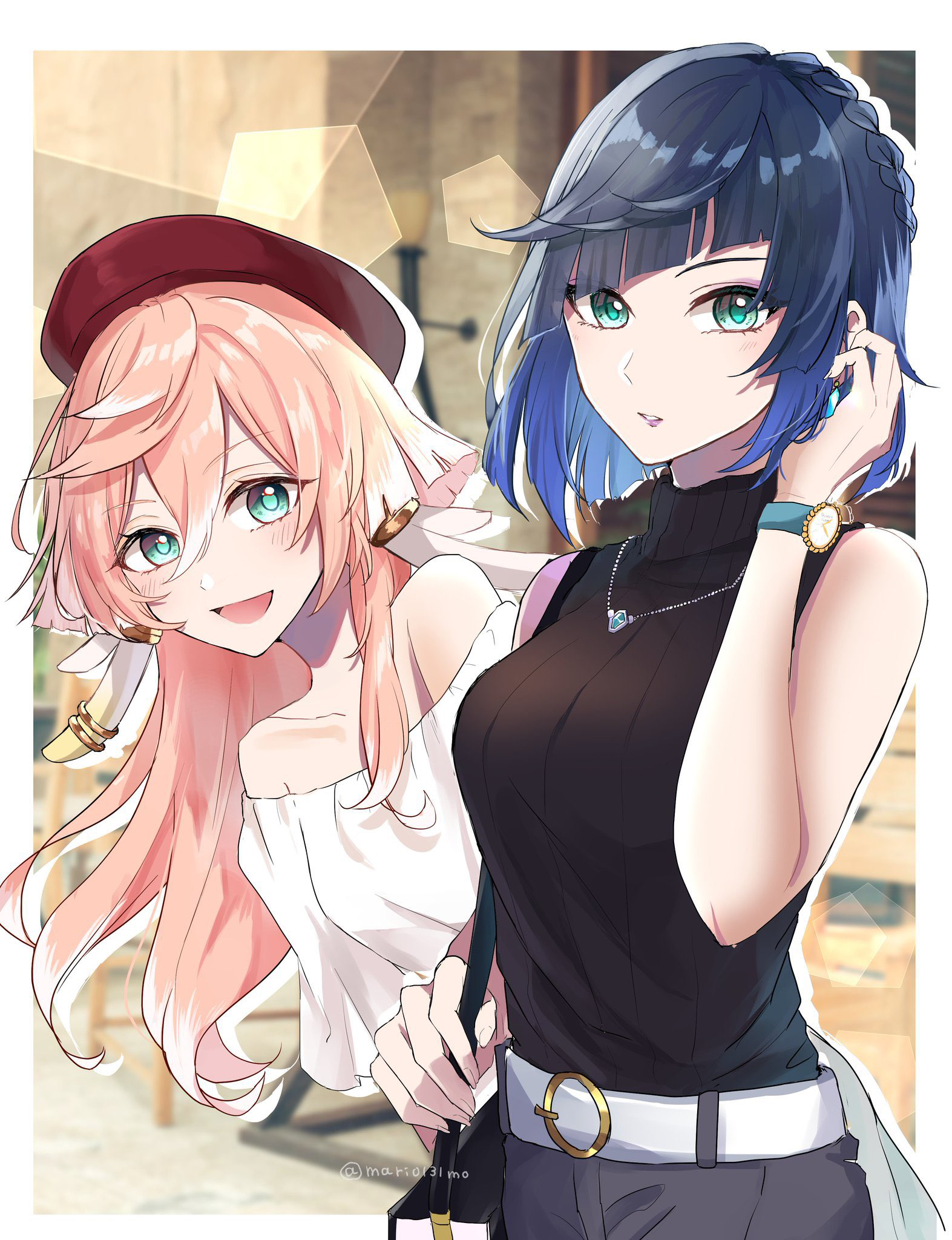 2girls alternate_costume antlers aqua_eyes bag bare_shoulders belt beret black_shirt blue_hair breasts commentary_request contemporary deer_antlers diagonal_bangs eyeshadow genshin_impact hair_between_eyes hand_in_own_hair handbag hat highres holding_strap horns jewelry leaning_forward long_hair looking_at_viewer makeup medium_breasts multiple_girls necklace off-shoulder_shirt off_shoulder open_mouth parted_lips pink_hair pomemi purple_eyeshadow red_hat shirt short_hair sleeveless sleeveless_turtleneck smile turtleneck twitter_username upper_body watch white_belt white_shirt wristwatch yanfei_(genshin_impact) yelan_(genshin_impact)