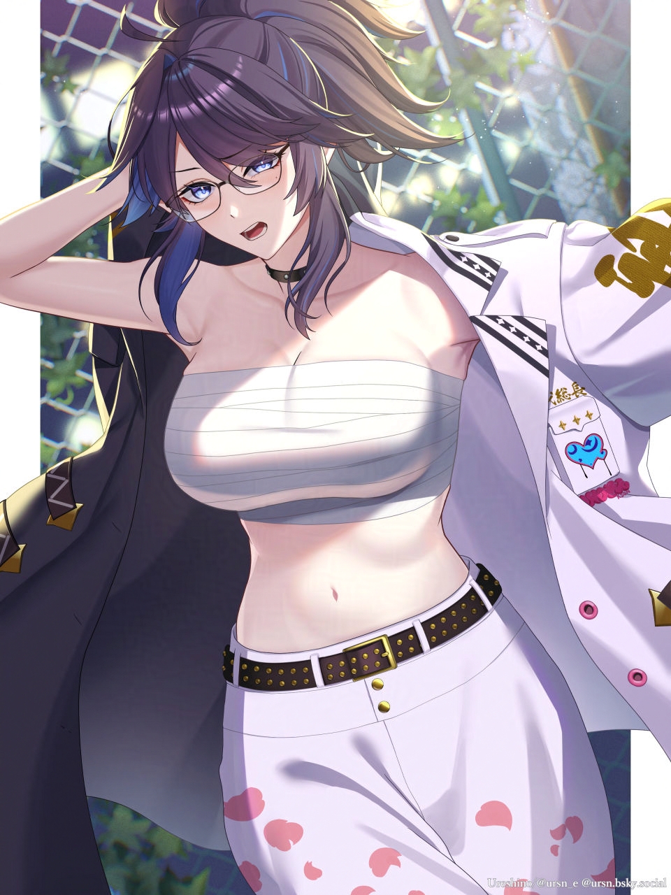 1girl ahoge belt black_hair blue_eyes blue_hair breasts chain-link_fence chest_sarashi cleavage coat fence glasses highres indie_virtual_youtuber jacket kson large_breasts looking_at_viewer midriff mole mole_under_eye multicolored_coat multicolored_hair multicolored_jacket navel open_mouth petal_print ponytail sarashi solo two-tone_coat two-tone_jacket ursn_e virtual_youtuber