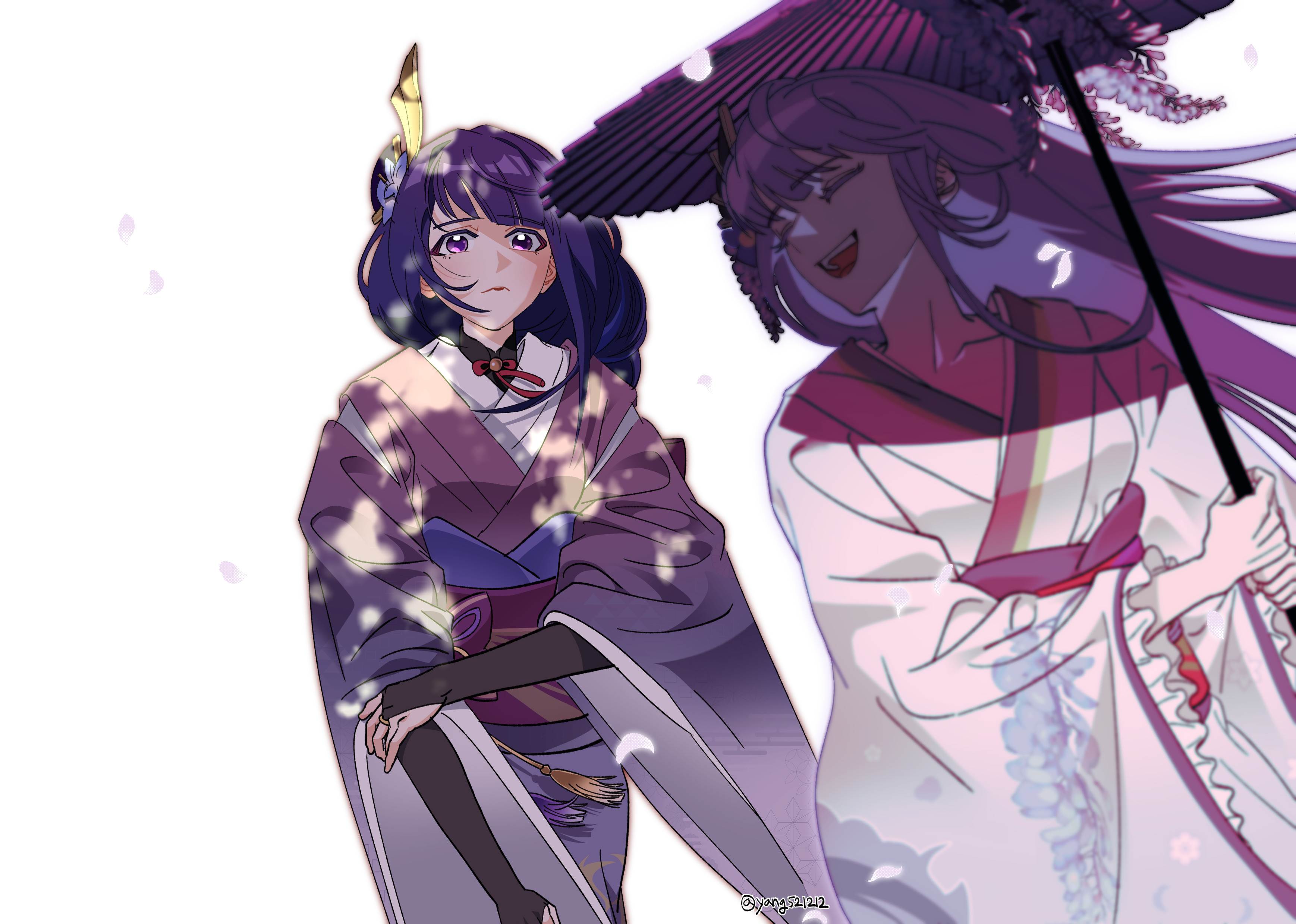 2girls absurdres artist_name blunt_bangs blurry braid bridal_gauntlets closed_eyes closed_mouth depth_of_field flower genshin_impact hair_ornament happy highres holding holding_umbrella japanese_clothes kimono long_sleeves looking_to_the_side makoto_(genshin_impact) multiple_girls oil-paper_umbrella open_mouth purple_eyes purple_hair purple_kimono raiden_shogun red_sash sash shaded_face siblings single_braid sisters smile standing twins umbrella upper_body walking white_background wide_sleeves wisteria yang521212