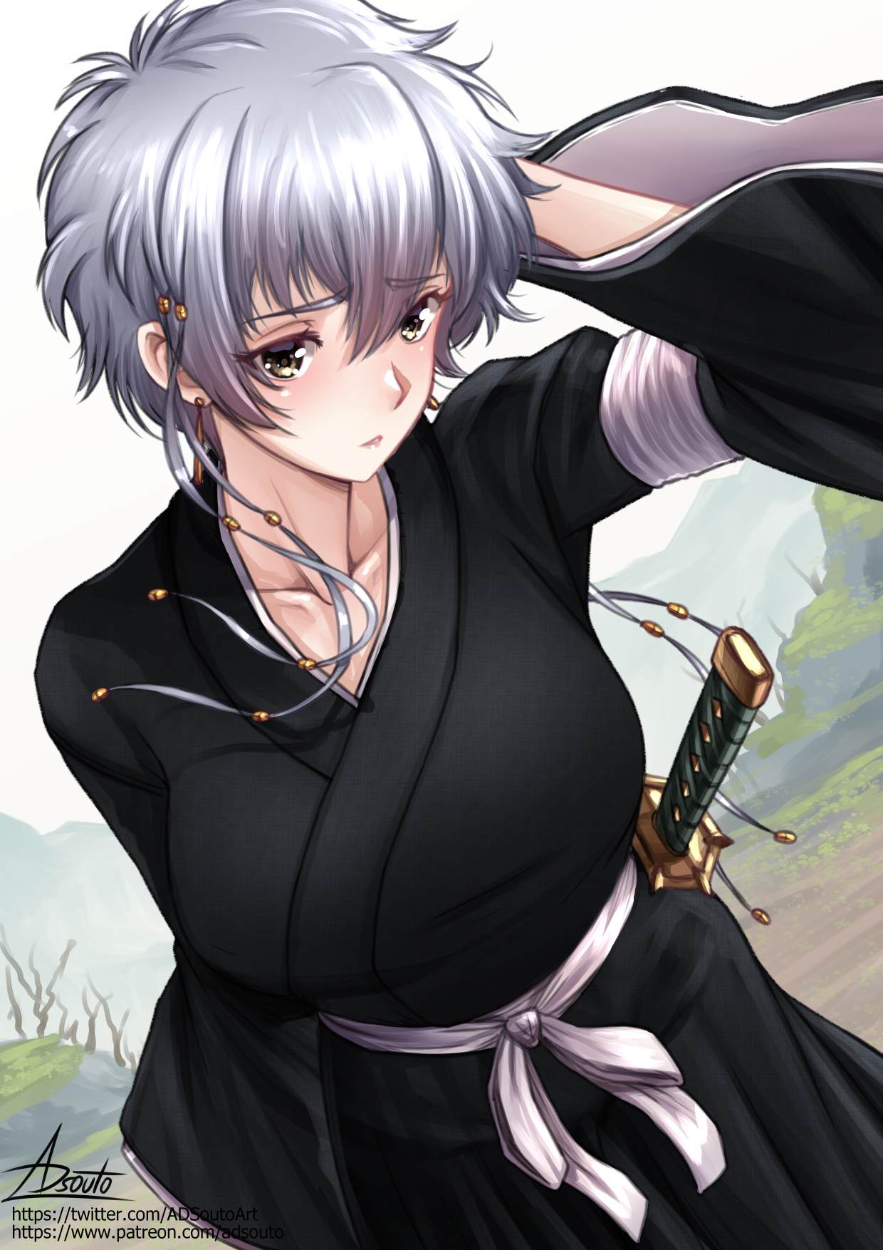 1girl adsouto arm_behind_head artist_name badge bleach breasts closed_mouth collarbone earrings female_focus fukutaichou_badge grey_hair japanese_clothes jewelry kotetsu_isane large_breasts outdoors patreon_username shihakusho short_hair sidelocks sky solo solo_focus standing sword twitter_username variant_set weapon zanpakutou