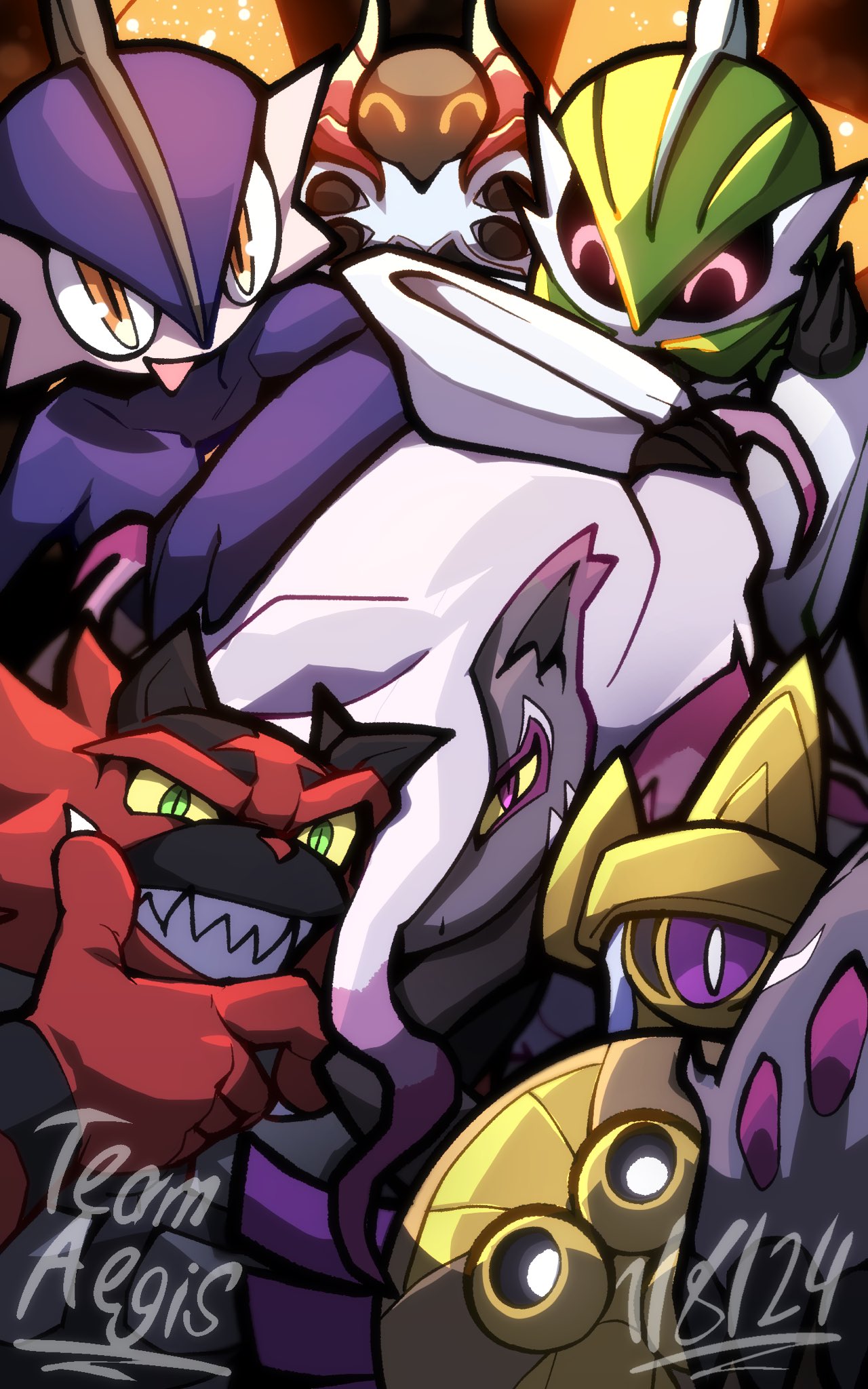^_^ aegislash alternate_color artist_name artsyaegis claws closed_eyes colored_sclera commentary dated english_commentary english_text fangs gallade gen_4_pokemon gen_6_pokemon gen_7_pokemon green_eyes grin hand_on_own_chin highres hisuian_zoroark incineroar iron_moth iron_valiant nintendo one-eyed open_mouth orange_eyes pokemon pokemon_(creature) pokemon_focus pokemon_team purple_eyes sharp_teeth shiny_pokemon slit_pupils smile teeth yellow_sclera