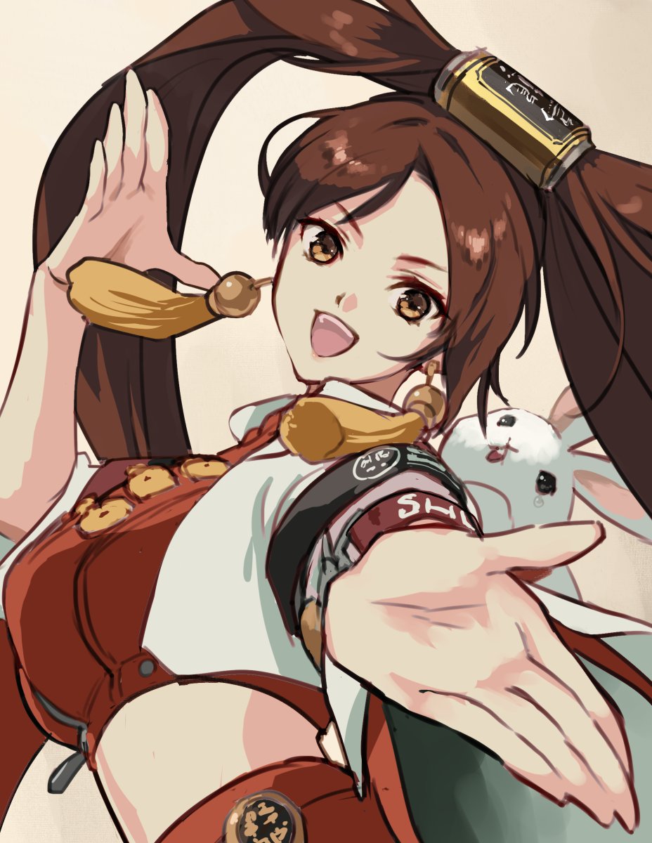 1girl arm_up breasts brown_eyes brown_hair chinese_clothes commentary_request crop_top earrings guilty_gear guilty_gear_strive hair_rings highres jacket jako_(toyprn) jewelry kuradoberi_jam long_hair looking_at_viewer open_mouth rabbit single_hair_ring smile tassel tassel_earrings very_long_hair white_jacket