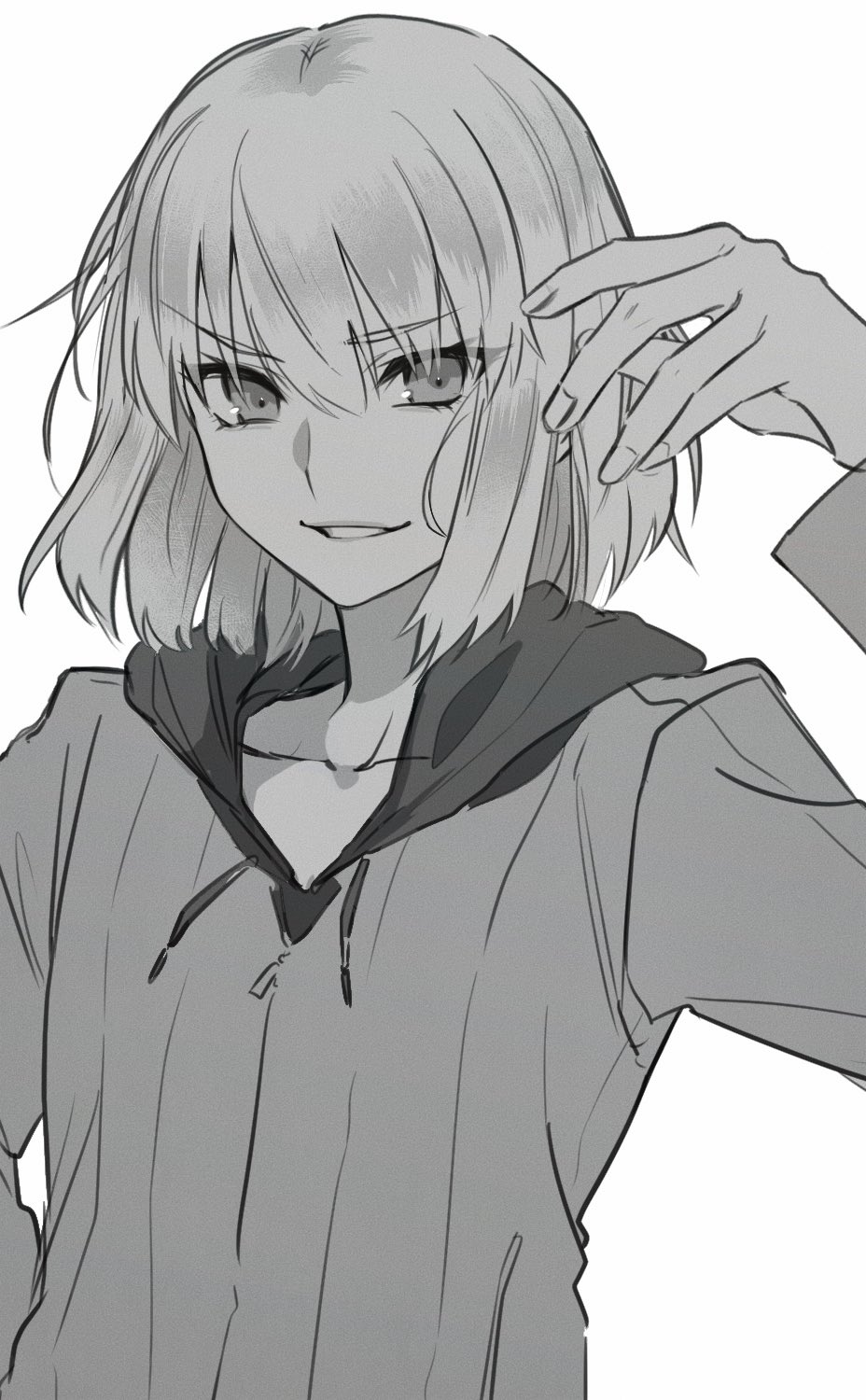 1boy arm_up collared_shirt commentary gpnr_47 greyscale highres hood hoodie long_sleeves looking_at_viewer male_focus mario_gallo_bestino monochrome shirt short_hair simple_background smirk solo tsukihime tsukihime_(remake) upper_body white_background