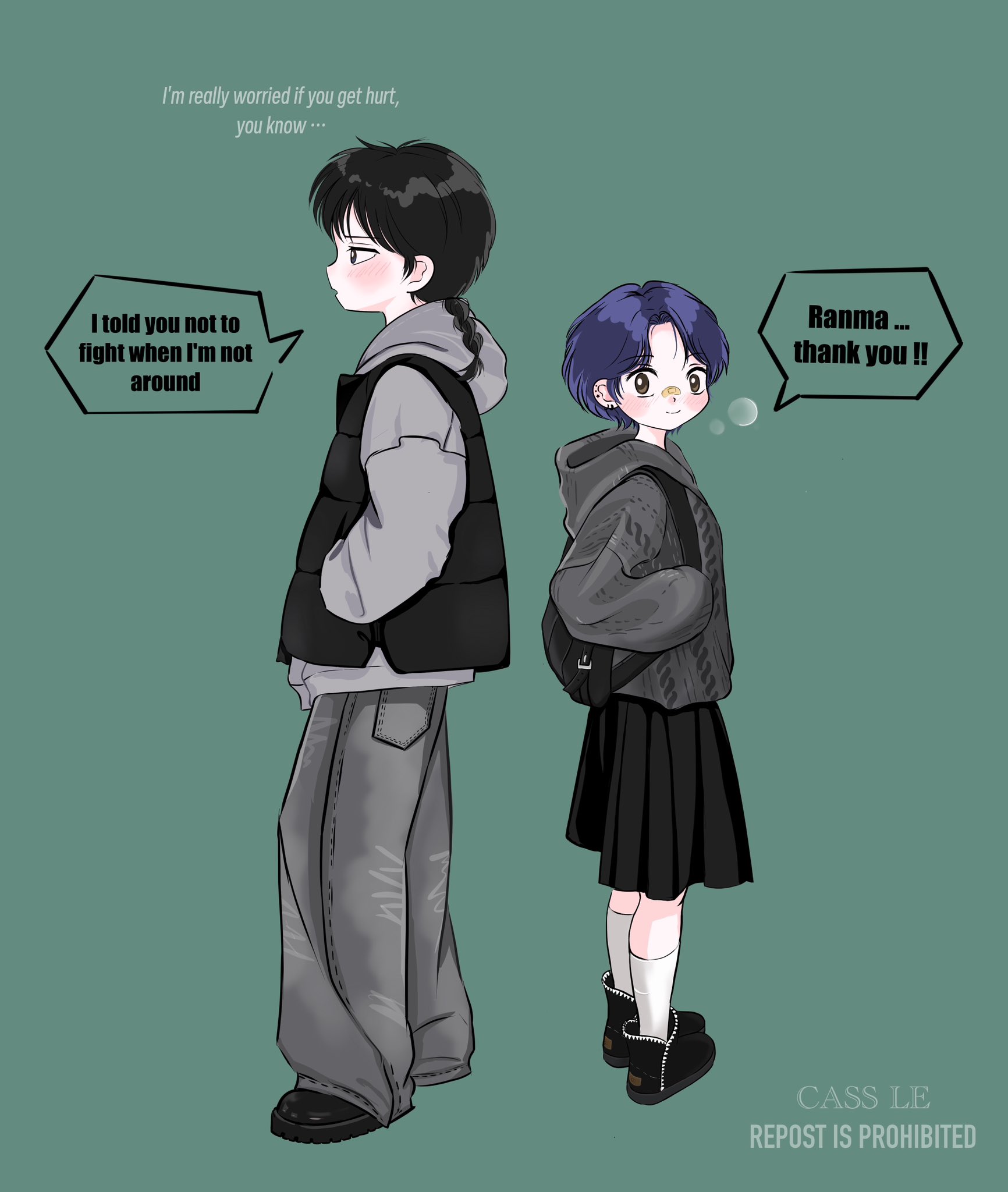 1boy 1girl bandaid bandaid_on_face bandaid_on_nose black_bag black_hair black_shoes black_skirt blue_hair braid brown_eyes cass_le92 commentary english_commentary green_background grey_pants highres pants piercing ranma_1/2 saotome_ranma shoes short_hair single_braid skirt smile speech_bubble tendou_akane