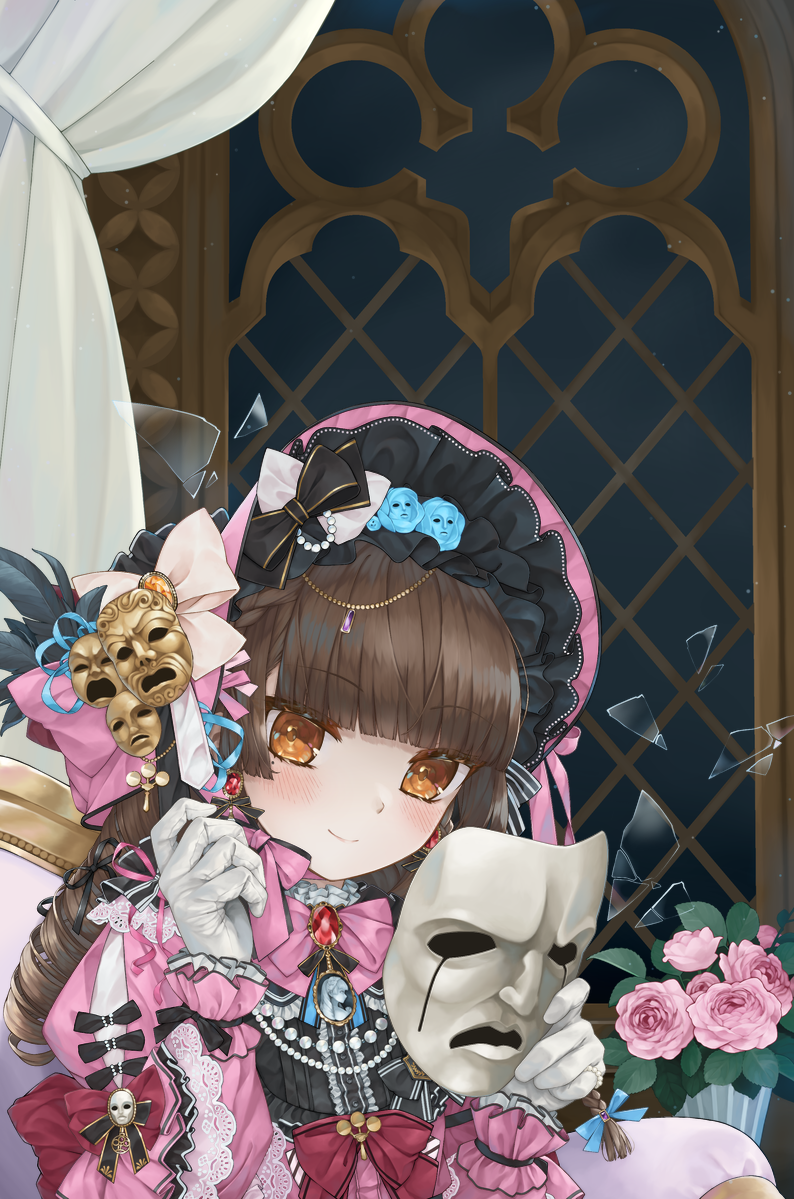 1girl black_shirt blue_bow blue_ribbon blush bonnet bow bowtie braid braided_sidelock broken_glass brooch brown_eyes brown_hair cameo_(jewelry) commentary couch curtains drill_hair english_commentary flower frilled_wrist_cuffs frills gem glass gloves grey_gloves hair_bow hat hat_bow holding holding_mask jewelry light_particles lips lolita_fashion long_hair looking_at_viewer mask mask_on_hat necklace on_couch orange_gem original pearl_necklace pendant pink_bonnet pink_bow pink_bowtie pink_flower pink_rose pink_sleeves plant potted_plant red_gem ribbon rose seisakgg shirt sitting smile solo vase window wrist_cuffs