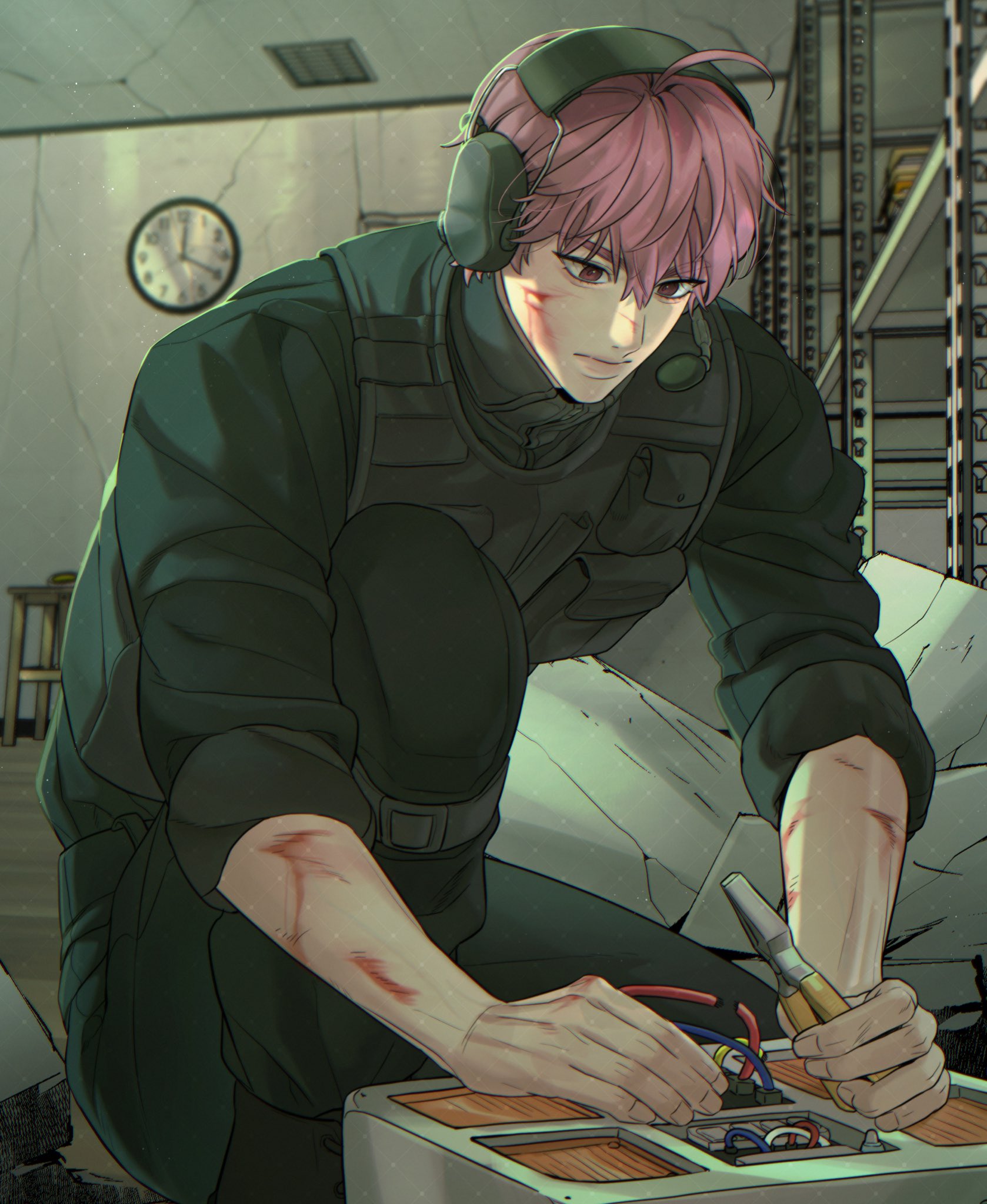 1boy ahoge an_sso_o bamby_(plave) black_shirt blood blood_on_arm blood_on_face bulletproof_vest clock closed_mouth commentary crack cracked_ceiling cracked_wall headphones highres holding_pliers indoors k-pop korean_commentary long_sleeves looking_at_object looking_down male_focus microphone pink_eyes pink_hair plave pliers shirt sleeves_rolled_up solo