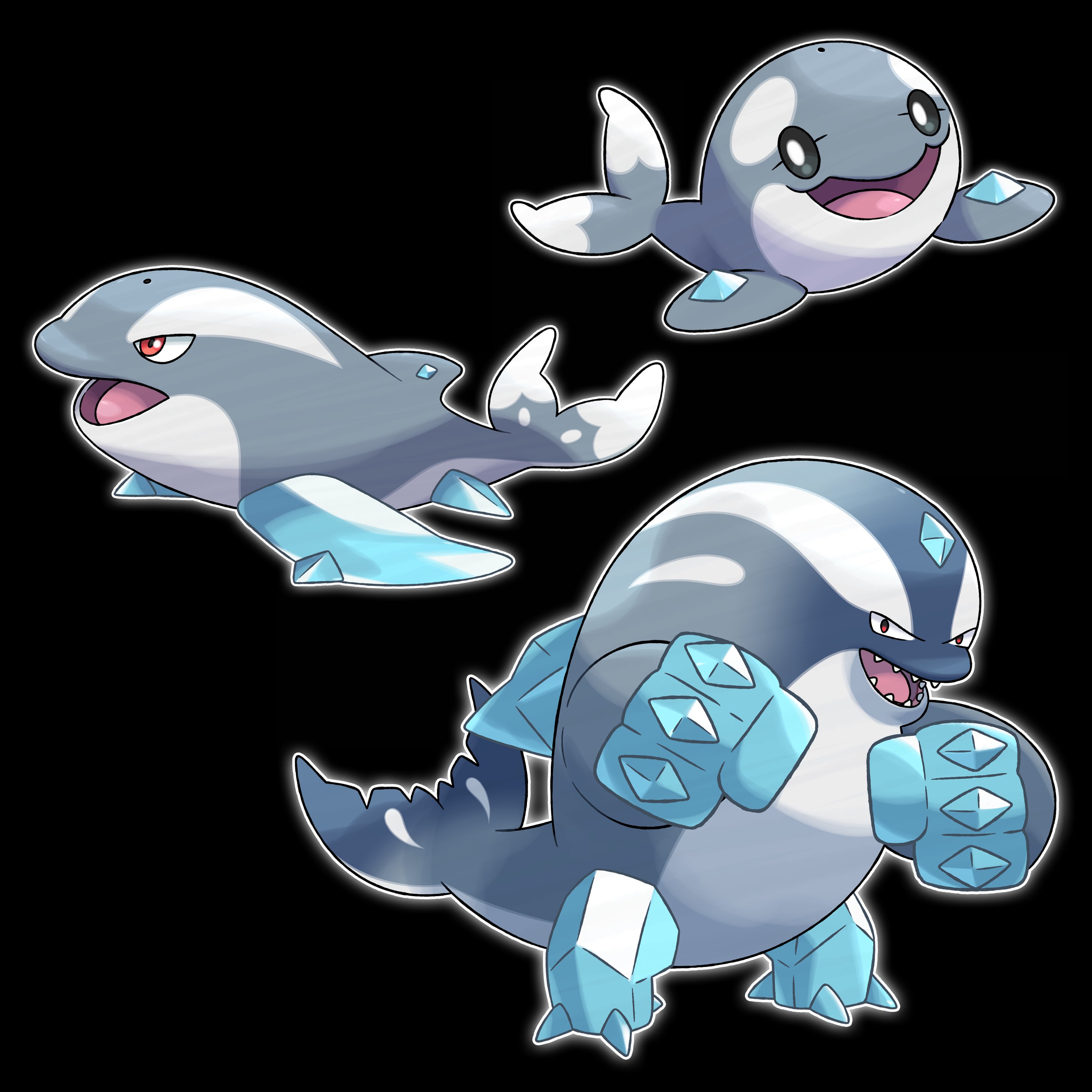 absurdres black_background bright_pupils colored_skin dolphin evolutionary_line fakemon grey_skin highres kosta looking_at_viewer multicolored_skin nintendo no_humans open_mouth original outline pokemon pokemon_(creature) red_eyes simple_background two-tone_skin white_outline white_pupils white_skin