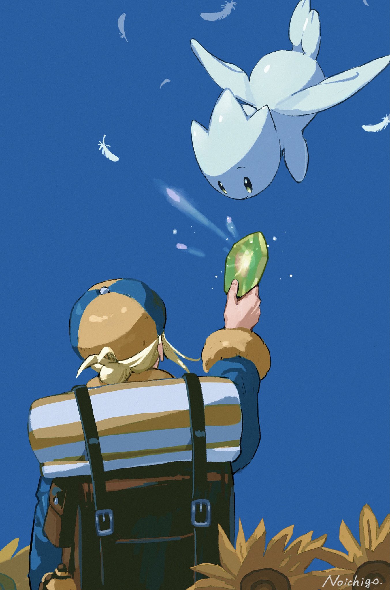 1boy backpack bag blonde_hair blue_jacket blue_sky dawn_stone evolution_stone feathers flower from_behind fur-trimmed_sleeves fur_trim gen_2_pokemon hat highres holding jacket long_sleeves male_focus newsboy_cap nintendo no_ichigo outdoors pokemon pokemon_(creature) pokemon_legends:_arceus shiny_stone_(pokemon) sky sunflower togetic volo_(pokemon) wings yellow_flower yellow_fur