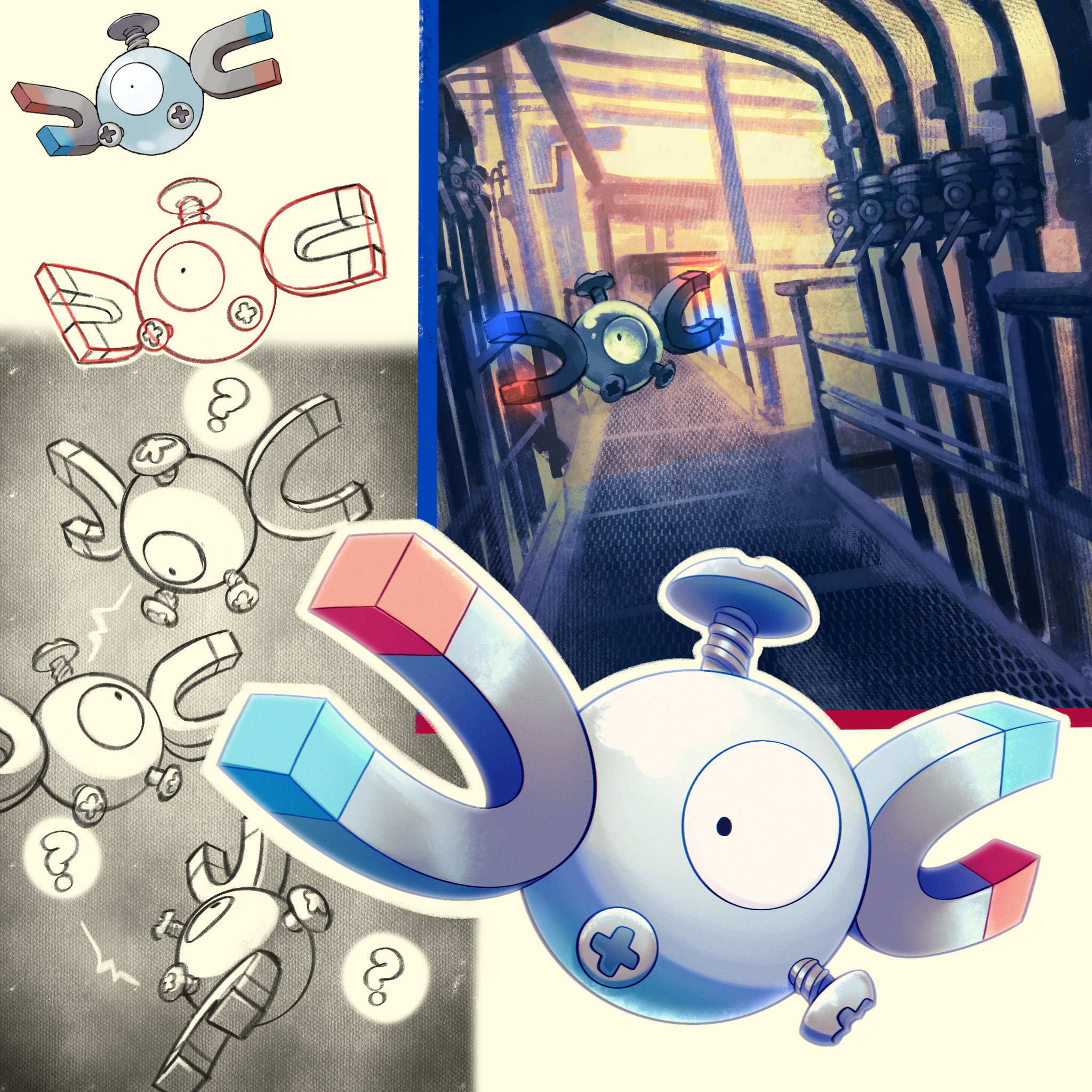 ? commentary_request electricity floating gen_1_pokemon highres magnemite magnet metal_skin nintendo no_humans one-eyed pokemon pokemon_(creature) pokemon_focus pokemon_firered_and_leafgreen railing screw shoupitsuki sketch