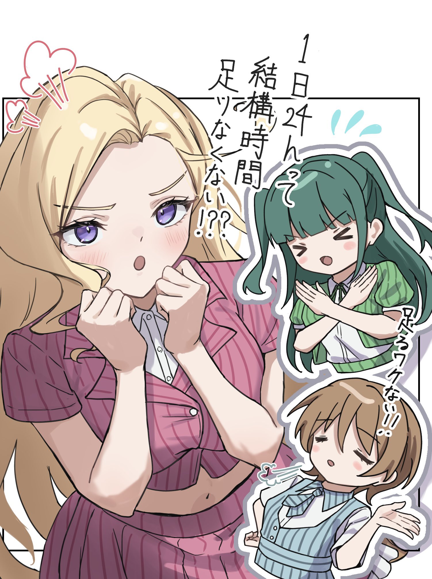 >_< 3girls :o blonde_hair blue_dress blue_necktie blunt_bangs blush breasts brown_hair clenched_hands commentary crop_top cropped_jacket diagonal-striped_clothes diagonal-striped_necktie dress flying_sweatdrops green_hair green_ribbon harumiya_yukuri highres ikizulive!_love_live!_bluebird jacket keitaro_tension konohana_aurora long_hair love_live! medium_breasts midriff multiple_girls navel neck_ribbon necktie open_mouth pinafore_dress pink_jacket pink_skirt pinstripe_dress pinstripe_jacket pinstripe_pattern pinstripe_skirt pleated_skirt plumina_(love_live!) puff_of_air puffy_short_sleeves puffy_sleeves ribbon shirt short-sleeved_jacket short_hair short_sleeves sidelocks skirt sleeveless sleeveless_dress striped_clothes translation_request two_side_up very_long_hair white_shirt x_arms yamada_midori