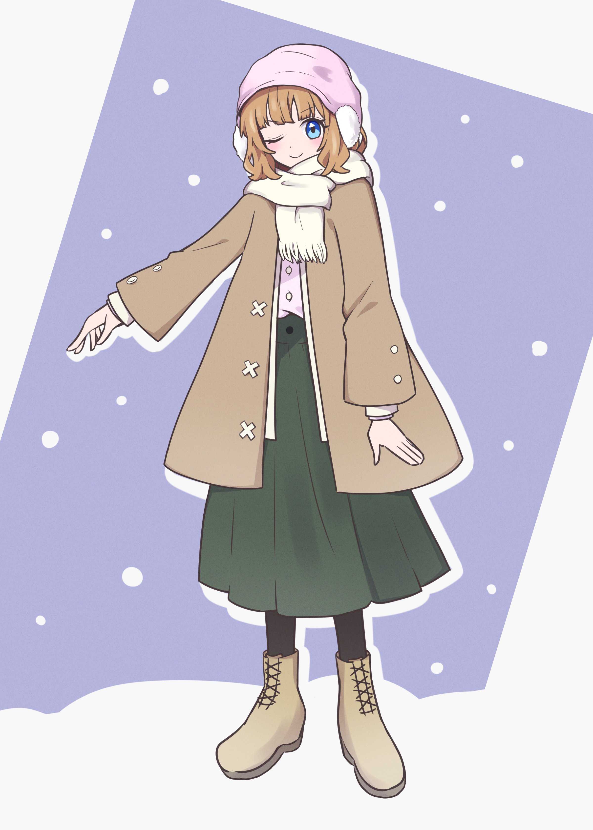 1girl absurdres blue_eyes blush boots brown_boots brown_coat brown_hair closed_mouth coat commentary_request earmuffs eyelashes full_body green_skirt hat highres idolmaster idolmaster_million_live! long_skirt one_eye_closed open_clothes open_coat pink_hat scarf short_hair skirt smile solo standing suou_momoko white_scarf winter-namaz winter_clothes
