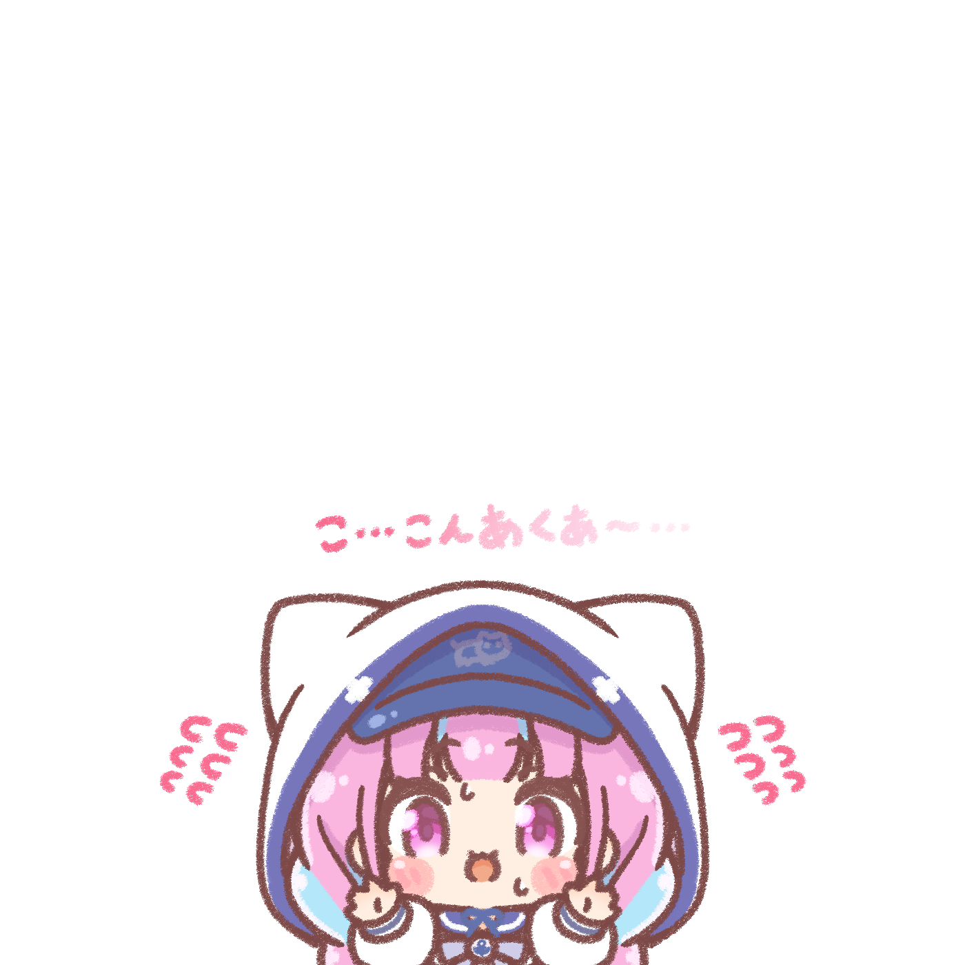 1girl :d anchor_symbol animal_ears animal_hood blue_hair blue_hat blue_sailor_collar blush_stickers braid chibi commentary_request fake_animal_ears flat_cap flying_sweatdrops hands_up hat hat_under_hood highres hololive hood hood_up hooded_jacket jacket long_sleeves low_twintails minato_aqua minato_aqua_(sailor) mitarashi_neko multicolored_hair open_mouth pink_hair puffy_long_sleeves puffy_sleeves purple_eyes sailor_collar simple_background smile solo streaked_hair sweat translation_request twin_braids twintails virtual_youtuber white_background white_jacket