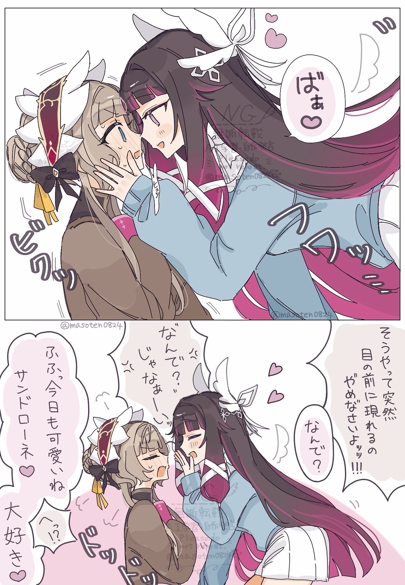 &{ID:13721954 CreatedAt:Tue Mar 24 22:30:32 -0500 2026 Score:2 Width:1310 Height:1890 MD5:052a1946acefd349a2c50c7117db14b4 Directory:05/2a Image:052a1946acefd349a2c50c7117db14b4.jpg Rating:general Source:https://x.com/masoten0824/status/2036627452701925528 Change:1774409432 Owner:danbooru CreatorID:6498 ParentID:0 Sample:1 PreviewHeight:350 PreviewWidth:242 Tags:2girls alternate_costume black_hair blue_eyes blue_sweater blush bonnet braid braided_bun brown_hair brown_sweater bun_with_braided_base closed_eyes closed_mouth columbina_(genshin_impact) commentary eye_contact face-to-face facing_another forehead-to-forehead genshin_impact gradient_hair hair_bun hair_flaps hair_ornament hair_ribbon hands_on_another's_cheeks hands_on_another's_face head_wings heads_together heart highres long_hair long_sidelocks long_sleeves looking_at_another masoten0824 multicolored_hair multiple_girls multiple_wings open_mouth pleated_skirt purple_hair purple_streaks ribbon sandrone_(genshin_impact) short_hair short_hair_with_long_locks sidelocks simple_background skirt smile streaked_hair sweater translation_request two-tone_hair untranslatable_commentary unusually_open_eyes very_long_hair white_background white_headdress white_wings wing_hair_ornament wings yuri Title: HasNotes:false HasComments:false FileURL:https://img2.gelbooru.com/images/05/2a/052a1946acefd349a2c50c7117db14b4.jpg PreviewURL:https://gelbooru.com/thumbnails/05/2a/thumbnail_052a1946acefd349a2c50c7117db14b4.jpg SampleURL:https://img2.gelbooru.com/samples/05/2a/sample_052a1946acefd349a2c50c7117db14b4.jpg SampleHeight:1226 SampleWidth:850 Status:active PostLocked:0 HasChildren:false IsVideo:false DisplayDate:24.03.2026 22:30}