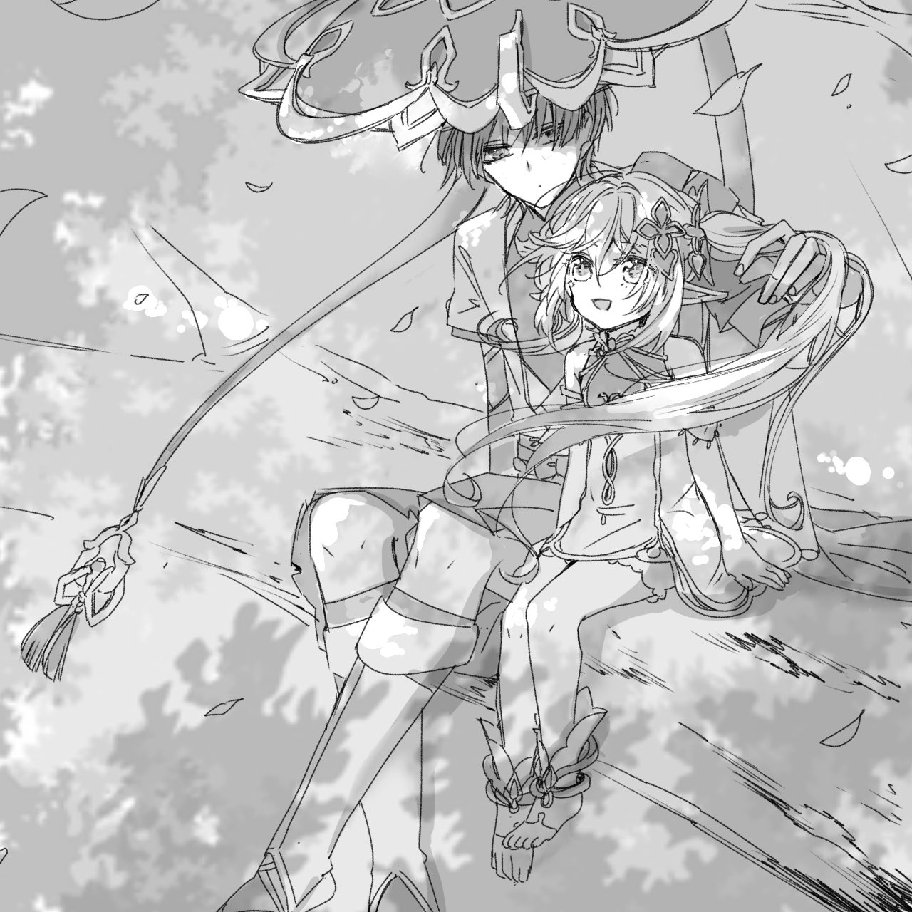 1boy 1girl anklet arm_at_side armlet arms_at_sides asymmetrical_sidelocks belt bloomers blunt_ends bodysuit bow commentary_request cross-shaped_pupils crossed_legs detached_sleeves dress falling_leaves fingernails genshin_impact greyscale hair_between_eyes hair_ornament hakama hakama_shorts hand_up hat heart heart_hair_ornament height_difference highres japanese_clothes jewelry jingasa juban kimono layered_sleeves leaf leaf_hair_ornament leg_warmers long_hair looking_at_another looking_up mandarin_collar monochrome nahida_(genshin_impact) open_clothes open_hand open_kimono open_mouth outdoors pleated_shorts pointy_ears rope scaramouche_(genshin_impact) shimizumikann short_sleeves shorts shoulder_peek side_cape side_ponytail sidelocks sitting_on_branch stirrup_legwear symbol-shaped_pupils toeless_legwear toeless_socks toes tree_shade tsurime underwear wanderer_(genshin_impact) wispy_bangs
