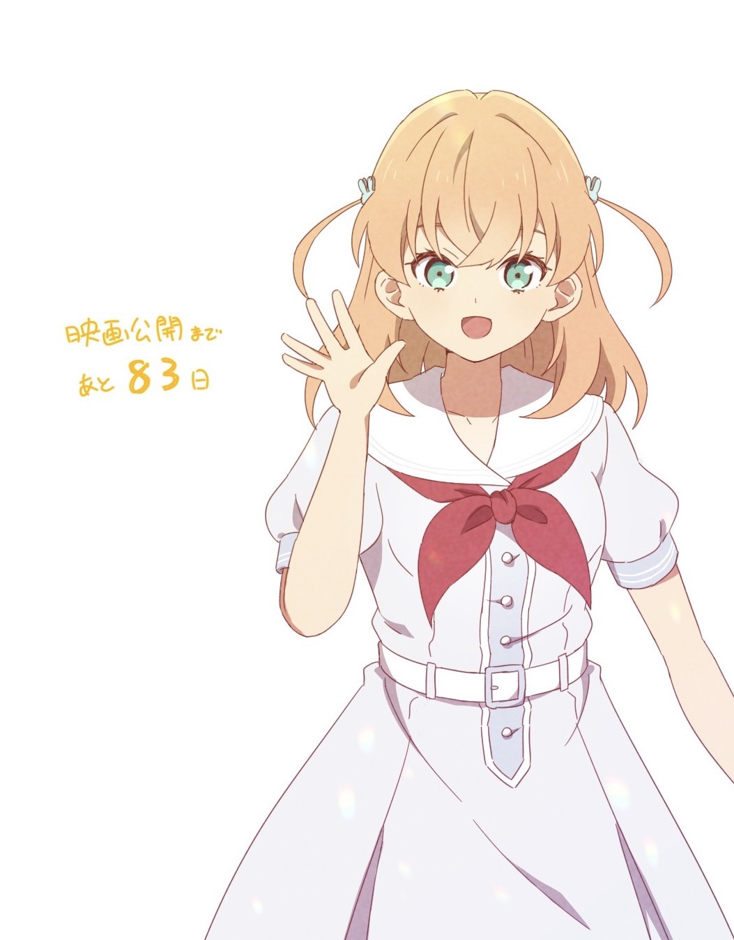 1girl :d aqua_eyes commentary_request countdown crossed_bangs dress eyebrows_hidden_by_hair hair_ornament hasu_no_sora_school_uniform highres hinoshita_kaho link!_like!_love_live! looking_at_viewer love_live! makki_do medium_hair neckerchief open_hand open_mouth puffy_short_sleeves puffy_sleeves rabbit_hair_ornament red_neckerchief sailor_collar sailor_dress school_uniform short_sleeves smile solo summer_uniform translation_request two_side_up virtual_youtuber waving white_dress white_sailor_collar
