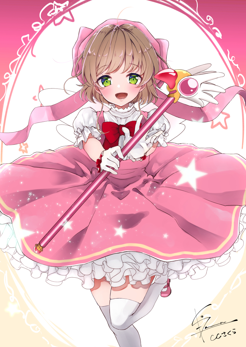1girl blush brown_hair cardcaptor_sakura commentary_request frilled_skirt frills gloves green_eyes hat highres holding holding_staff kinomoto_sakura kodama_(koda_mat) magical_girl open_mouth pink_ribbon ribbon shoes short_hair skirt smile staff thighhighs white_gloves white_thighhighs