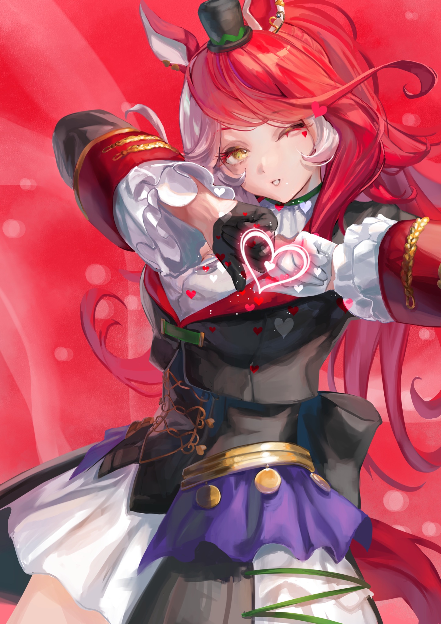 1girl animal_ears asymmetrical_gloves black_gloves black_hat black_jacket blush colored_inner_animal_ears commentary_request facial_mark frilled_sleeves frills gloves hands_up hat heart heart_facial_mark heart_hands highres horse_ears horse_girl jacket long_hair long_sleeves looking_at_viewer loves_only_you_(9927_wishes)_(umamusume) loves_only_you_(umamusume) mark_under_eye mini_hat mini_top_hat mismatched_gloves one_eye_closed qdx4p red_background red_hair solo top_hat umamusume white_gloves white_hair yellow_eyes